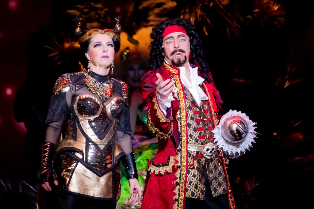 In text Photo: Sara-Jeanne Hosie as Helga Hook and Ross Petty as Captain Hook