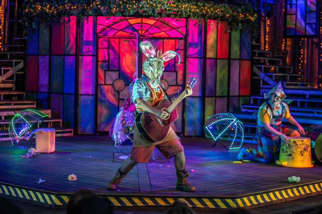 Jackie Chau and Logan Raju Cracknell have created a dynamic design through the costumes, set, and lighting. They create such a clear juxtaposition between the rude mechanicals and the royal/fairy courts. The stand out for me is the use of LEDs to make stunning props and costumes. I immediately asked my partner for a robe like Titania’s, and I certainly wouldn’t mind one of the glowing umbrellas either! They add an element of delight and surprise to the performance. I love how as the sun goes down, the lighting gets all the more impressive, as we can see how the beautiful stained-glass doors and windows play in the light. The only element of the design I didn’t fully understand was all of the garbage around the stage; I know that at the beginning Steven Hao talks about the ecological message behind the show, but at times I felt that the bags were just being moved or used to give the actors something to do, rather than having a meaningful impact on the scene itself. I would have rather taken in the full splendour of the set on its own, and had the trash removed as the show went on.