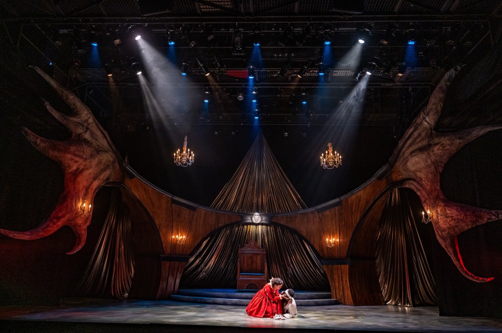 The design of this production is sensational. Nick Blais’ set design is breathtaking; the giant antlers protruding from the middle of the stage a constant reminder that this is a show about beasts and monsters. The opulence of the gold draping and guided cages add to the courtly feel of the set, while the bust of Henry’s father, the King, looms over everything; a perfect representation of his contestant presence without being portrayed on stage. Michelle Tracey’s costumes for this production are glorious; a beautiful representation of the ages depicted throughout the play. I loved the little touches like the fact that Henry is initially wearing sneakers, a sign that he’s not accustomed fully to his Princely status at court. I also was delighted by the little nods to the Disney classic: at one point Catherine is in a yellow dress, while Pete (the wild man) has a blue ribbon to tie back his hair and is dressed very much like the Beast in the movie. Catherine’s costumes in particular not only showed the change in time period but also in her inner being, going from a pure white bride to a fur cloak and leather wear. Every detail in WILDWOMAN has been thought of, and adds beautiful layers of meaning to the play. Kimberly Purtell’s lighting and Maddie Bautista’s sound design complete the ambiance of the production; I’m still laughing at the Mel Brooks-style screams every time the dungeon was referenced.