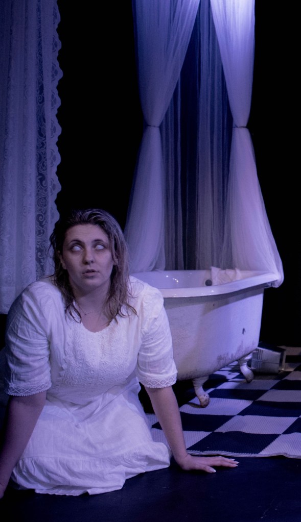 It’s amazing to see how the Red Sandcastle has been transformed for this production; they use the space in a unique way and had a cohesive vision for each design element. The fact that the whole set was black and white, save for their blue flowers and some rust on the sides of the tubs, made the performance feel like an old horror film. The lace curtains give this feminine feel to the set, yet somehow also felt foreboding and eerie. The costumes are entirely white as well, and I appreciated the attention to detail; I’m sure it cannot be comfortable to be soaking wet AND in a corset with underthings underneath and a dress on top! However, their whited out eyes were by far the most terrifying aspect of the costume design; it took me a while to fall asleep that night with those haunting faces still fresh in my memory.