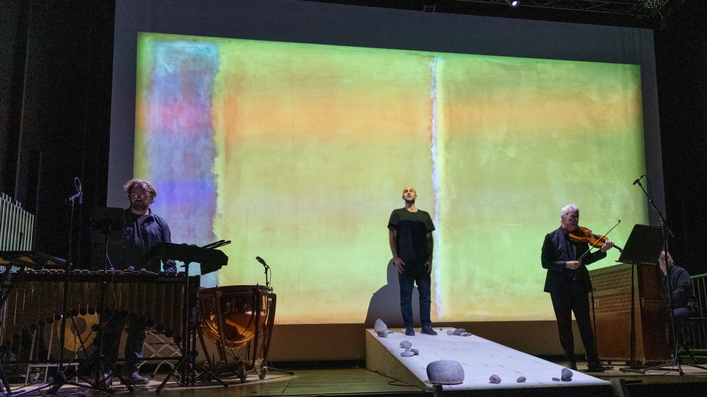 The first piece of The Bright Divide is “Rothko Chapel” by Morton Feldman. Feldman was a very good friend of modernist painter Mark Rothko. The Rothko Chapel is a nondenominational chapel in Houston, Texas. Unfortunately, it was completed after Rothko’s untimely death, and he never got to see his 14 giant canvases hanging there. Feldman was commissioned to write the piece for the opening of the Chapel itself. The Bright Divide begins with a song by Peter Gabriel called Fourteen Black Paintings, which is based on the Rothko Chapel canvases. While we listen, we see projected images of the paintings on the chapel walls, a stunning visual of Rothko’s accomplishments.