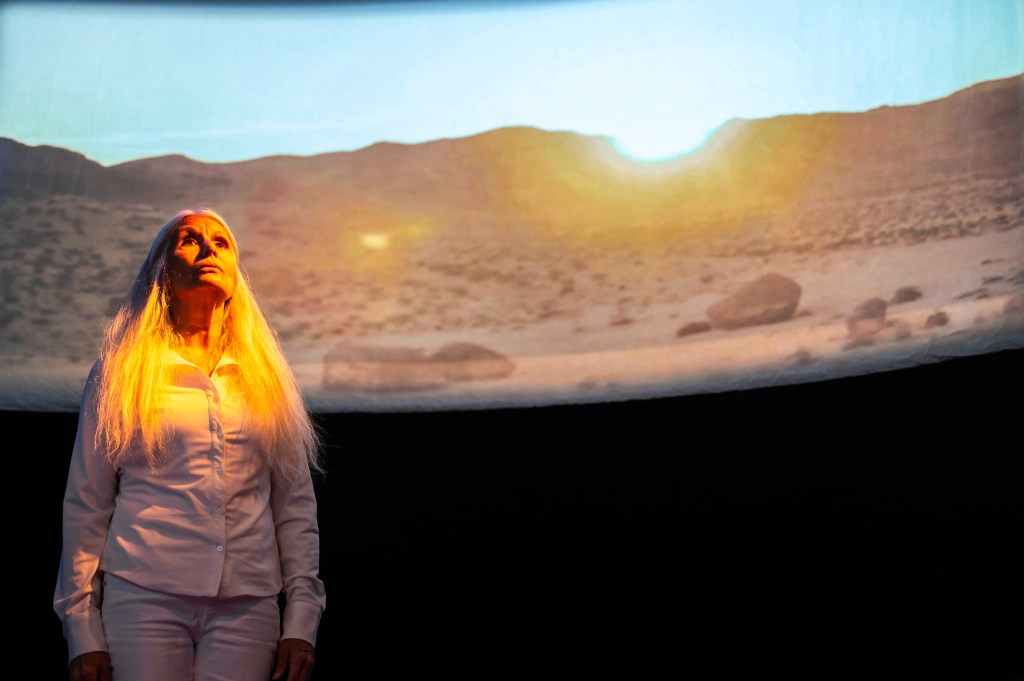 The Coal Mine Theatre has once again transformed itself to host this marvellous production. Prophecy Fog is performed in the round, with part of the audience sitting on padded benches and the rest in a larger circle on chairs behind them. Above our heads is a large circular screen where projections are played throughout the performance. This intimate and meaningful setting makes it all the more easy to lose yourself in the majesty of what you’re witnessing.