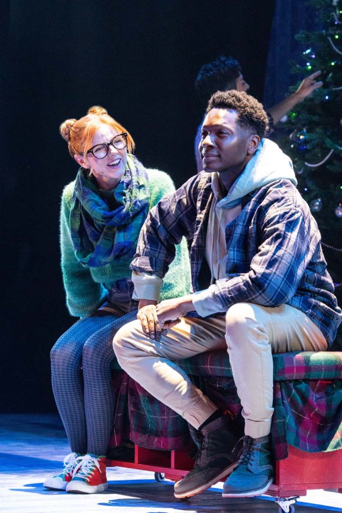 Speaking of Broadway, the absolutely stellar cast of Chris, Mrs. has members who have also spent some time on the great white way, as well as taken leading roles in more local festivals like Stratford and Shaw. Liam Tobin stars as Ben Chris, and watching his transformation from all-business-Scrooge to Christmas-loving-father is magical. Tobin has an incredible voice and a charm and ease about him that makes him instantly loveable. Danielle Wade shines as Holly Carmichael, her soaring voice and natural charisma making her a perfect fit. She is immediately endearing to the audience and her vivacity lights up the room. Taking centre stage as the stepmother-to-be is Olivia Sinclair-Brisbane as the sexy, metropolitan Vicki Vandrelle. Her solo number “Vicki’s Lament” is an absolute show-stopper and sends the audience into intermission saying “wow!” AJ Bridel is absolutely darling as Claire Chris; her awkward teenager mannerisms are spot on. She also gets to show off her stunning voice, especially in an amazing number with her love interests played by Andrew Broderick and Henry Firmston. Opening night, I saw Addison Wagman and Lucien Duncan-Reid who are fantastic as the Sams (some performances you’ll catch Finn Cofell and Isaac Grates-Myers in these roles). The two of them certainly have bright futures ahead of them of these performances are any indication! Rounding out the cast is Kale Penny, Sarah Lynn Strange and Mark Weatherley, who all bring a kindness, grace, and cheer to their roles.