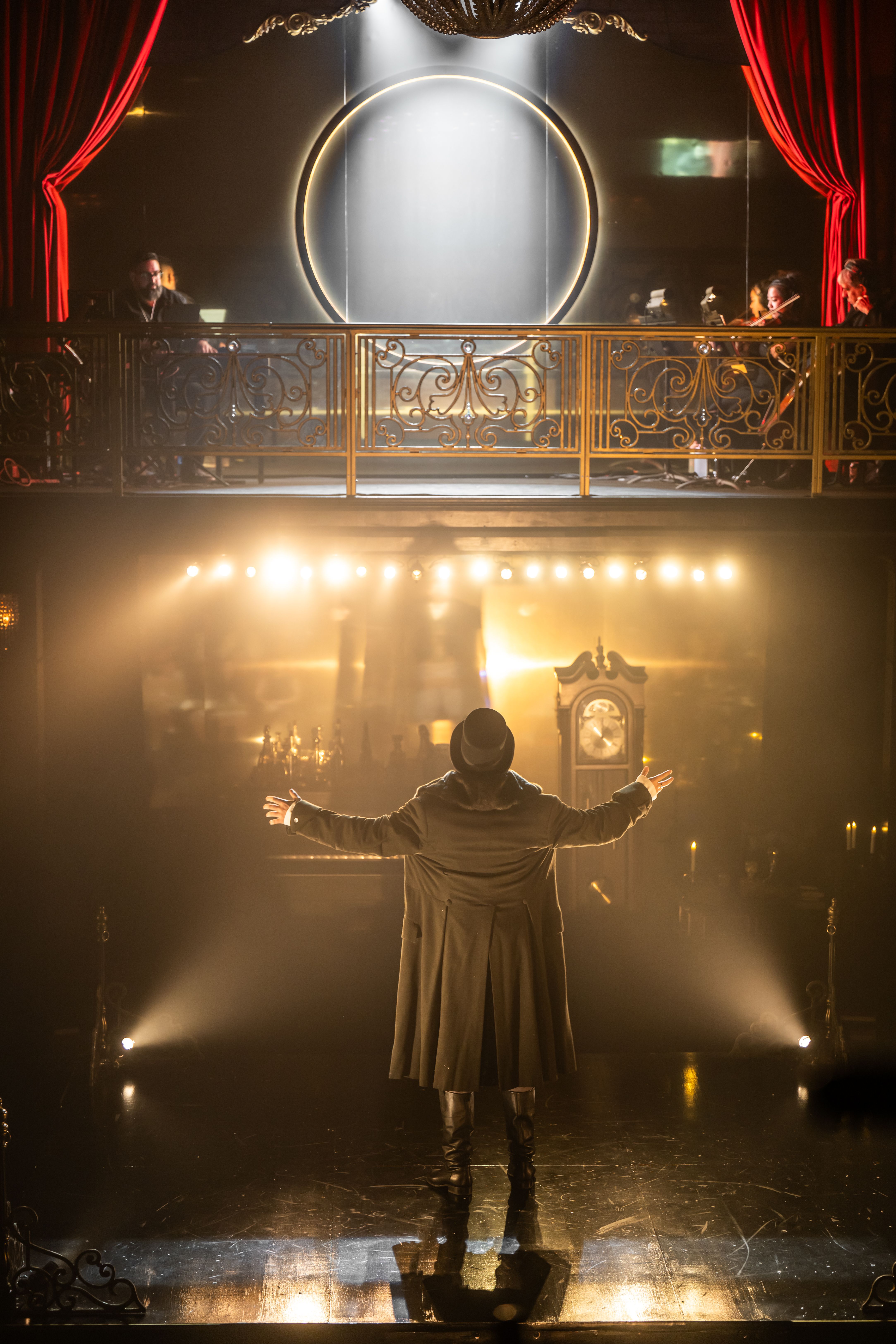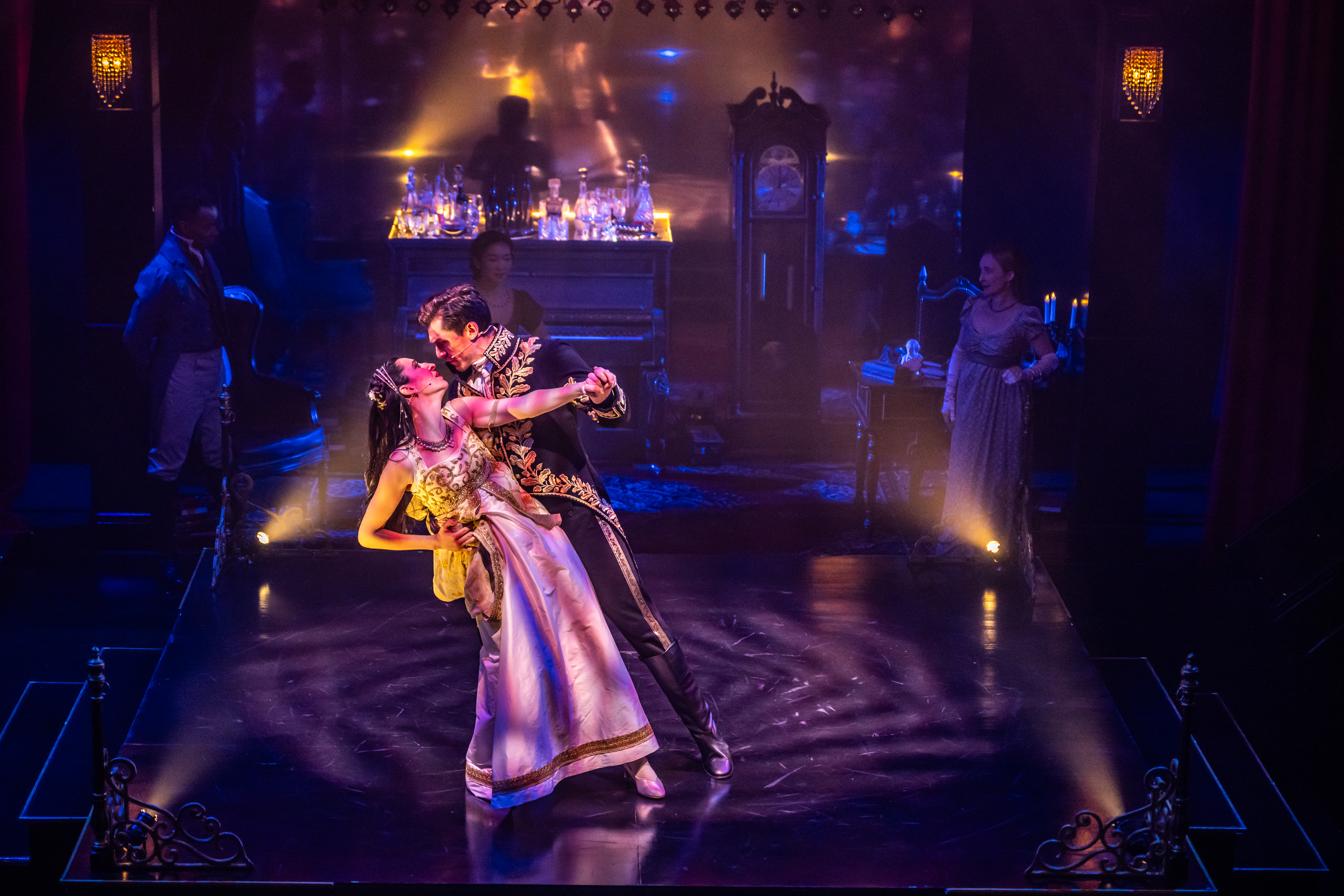 Julie Fox and Joshua Quinlan’s opulent set design only heightens our feelings of involvement in the production. There are barstool and balcony seats which are very close to the action, as well as little cabaret-style tables for the front row of seating. The audience is sat on three sides of the stage, with an incredible, rotating platform in the middle of the space. The lush curtains, gold accents, mirrors and chandeliers all provide the luxurious feel to this opera space into which we’ve entered. Ming Wong has created another set of eye-popping costumes for this production. I love that they’re period appropriate with some absolutely stunning fabrics for the ladies dresses in particular. The fur-lined coats give us the feel of the Russian winter, while the stately and decorated military jackets remind us that the war is not far off from the minds of these characters. Kimberly Purtell’s lighting design for this production is spectacular as well; with spot lights having to follow the actors as they navigate through the space, plus all of the LED’s and chandeliers as accents, it was truly a marvel. There was a moment where the largest chandelier was used to cast a sparkling light all over the room and I was in total awe of the brilliance of it all.