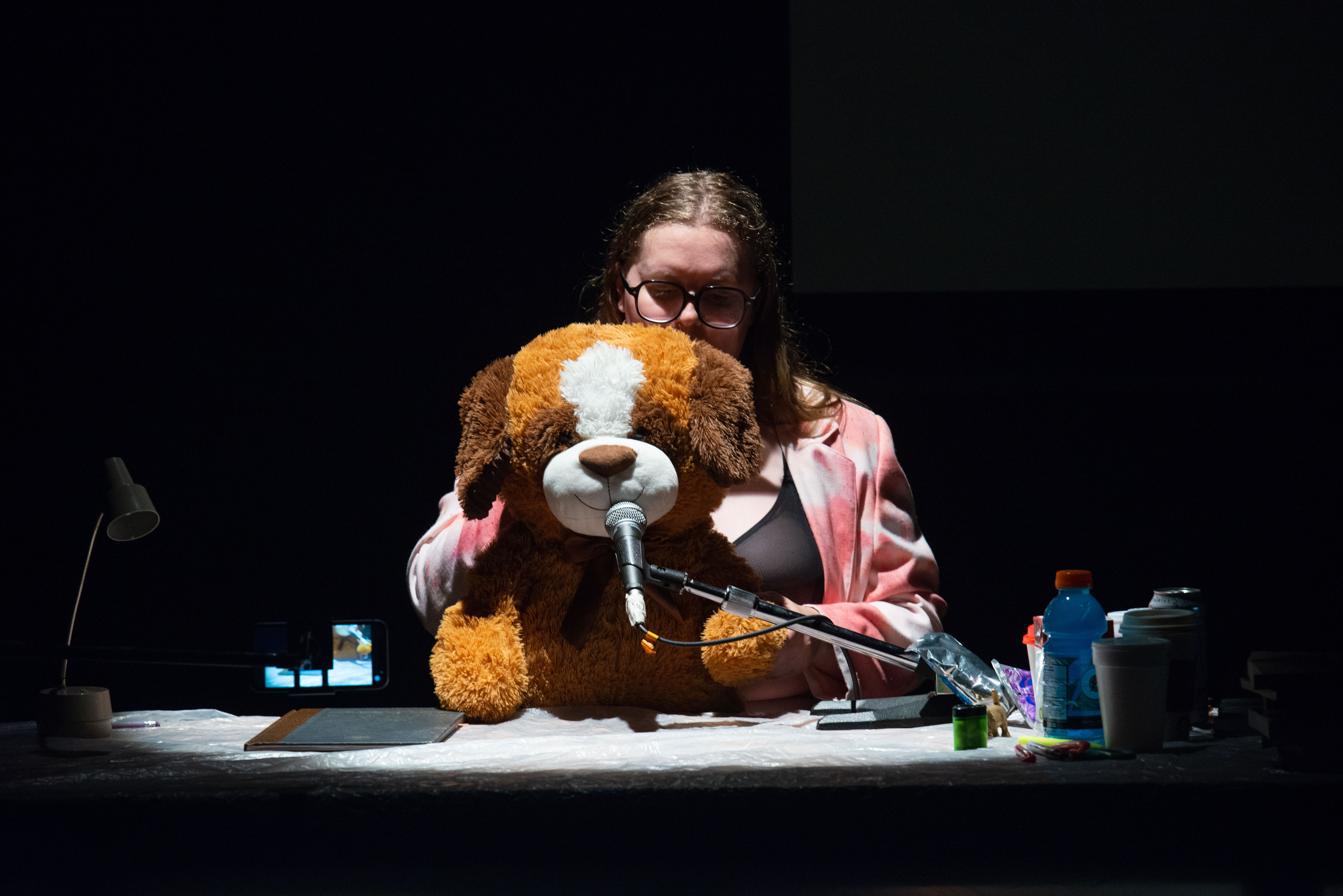 Not only is this the first piece featured in their anthology, it’s also the first play the two co-founders worked on together. Rather than being acted out, Plett was seated next to an overhead projector, which then allows the audience read the story. Along with the text on the projector, there were also gifs displayed throughout the story and certain text which was pre-animated and projected. A unique experience to be sure; you could hear a pin drop in that room, and yet it made our laughter at the comedic sections that much better. The story is simultaneously of Plett and Patterson’s relationship transforming from friendship to more, but then also of the narrator’s own transition, as well as healing from childhood trauma. While it dealt with a great deal of difficult subject matter, the overall feeling I was left with was the hope and brightness of the healing and love which ultimately won the day.