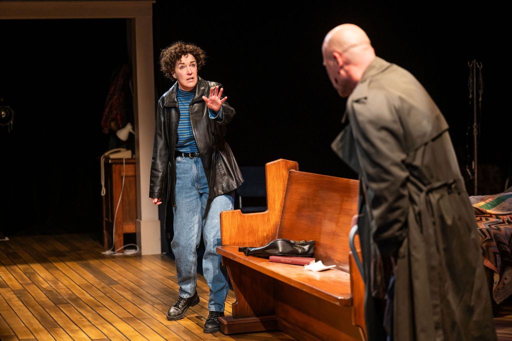 Joshua Quinlan’s set and costume design for Casey and Diana totally hit the mark for me. I love the inclusion of June Callwood’s desk, with its candle burning for the residents who had passed. The stained-glass windows and peaked ceiling of the Victorian-era house which initially housed Casey House is an immediately recognizable aesthetic. As are the costumes which thrust me back to the early days of my childhood immediately! In particular, you can see the attention to detail which went into Diana’s costumes; they are note perfect for what the Princess actually wore on her visit (check out the Casey House website for some photos). Everything down to Pauline’s perm was peak 90’s and truly immerses the audience in the world of the story.