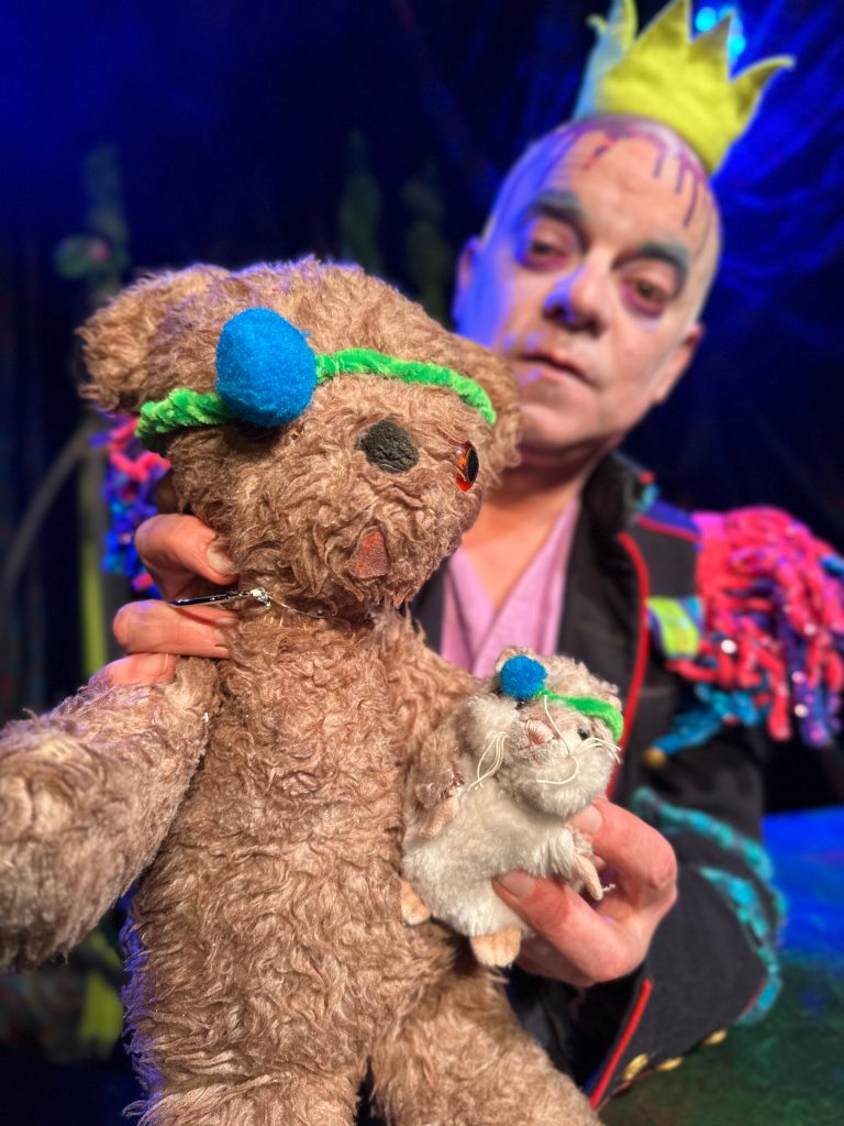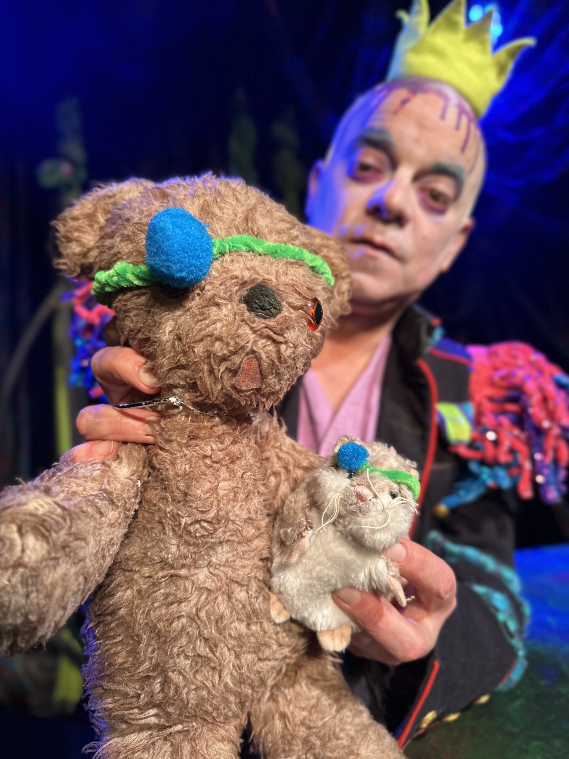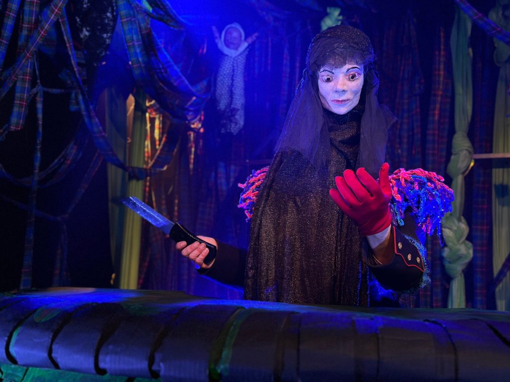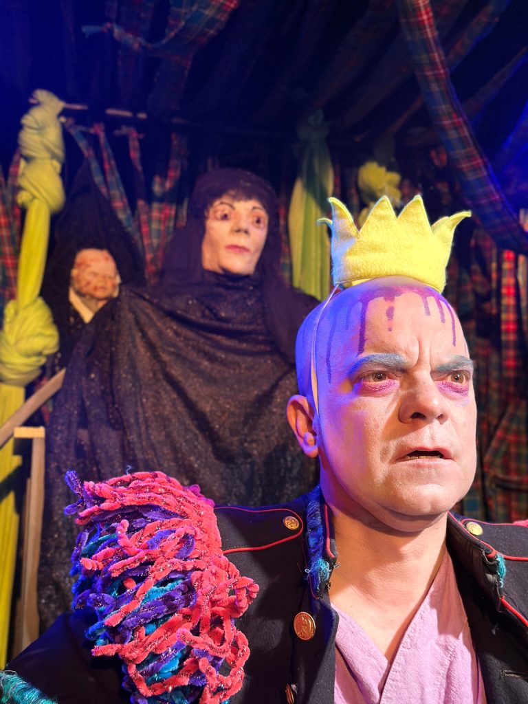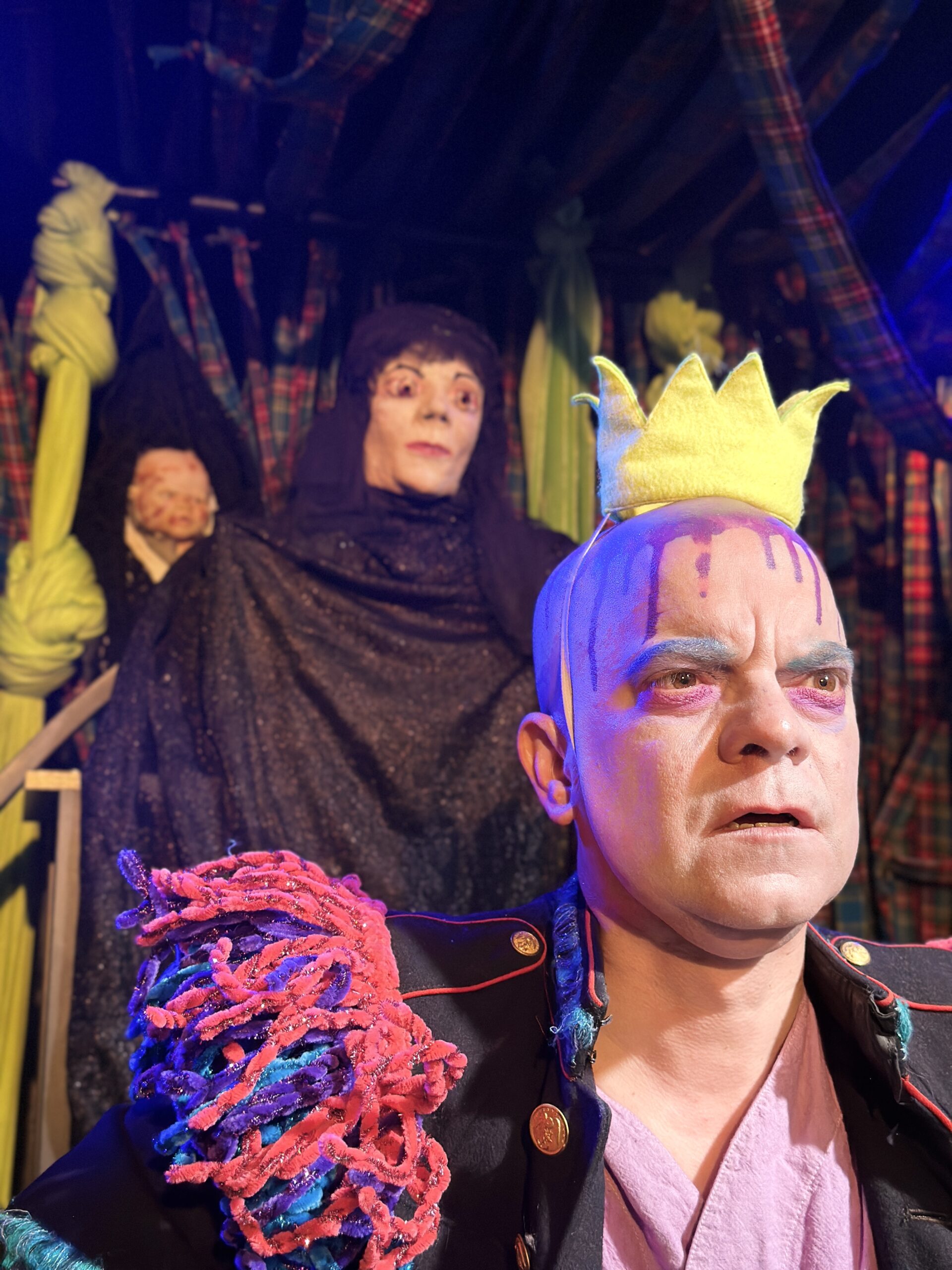 Director Dylan Trowbridge helms the creative team along with Woolfe, and the two of them are a dynamic duo of entertainment. Melanie MaNeill’s design of this show is excellent; you can easily see the thought and planning that went into it. The tattered tartans which surround the playing space is a concrete reminder of the location of the play, while the baby dolls scattered about the tatters portend the weird sisters’ premonitions. I also really loved the coat worn by Macbeth throughout the show; the juxtaposition of the bright militaristic-style adornments on the navy jacket is a beautiful encapsulation of the story’s constant struggle between the real and surreal. The piece-de-resistance for me is the cauldron which acts as the main focal point and playing space. Not only does it provide ample room for Woolfe to do his puppetry and magic, but it acts as a reminder that we are under Woolfe’s spell while we are in the theatre.