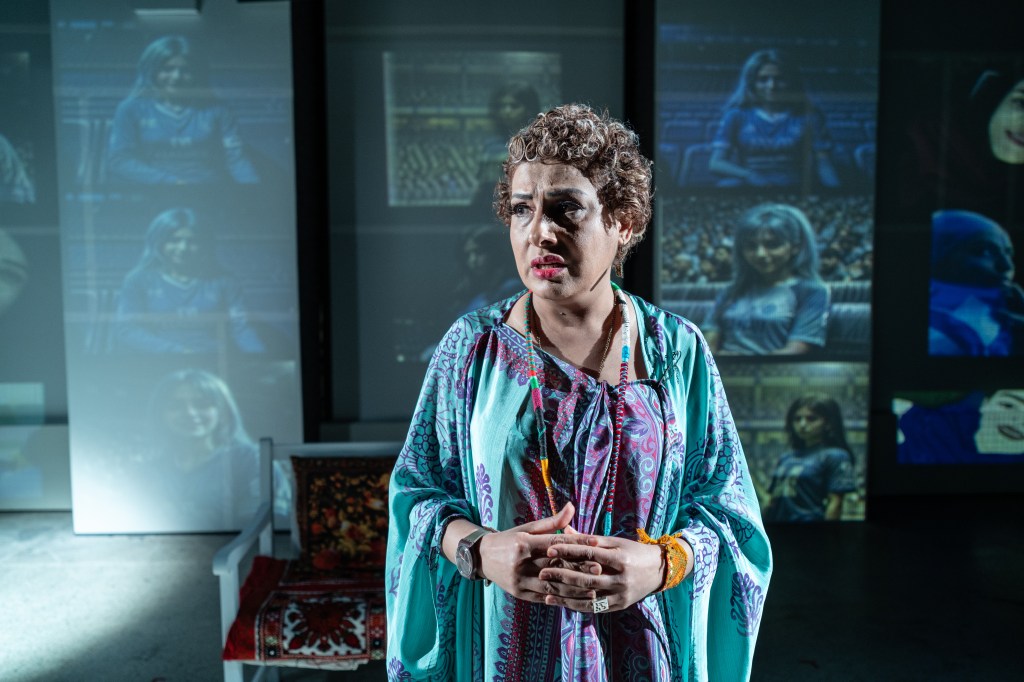 Amin Shirazi’s set design is simple yet effective. The contrast between the brightly patterned pillows and tablecloths with the stark white furniture is representative of Homa’s mental and emotional state. The cork boards in the first act full of Homa’s ideas for her podcast are a great addition to the set; it totally makes sense that as a creative person she’d have little sticky notes everywhere with ideas for future episodes and what to research etc. When the notion of The White Room is introduced at the end of the play, the set design takes on a whole new and profound meaning; it’s clear that a piece of Homa never truly left that room at all. The team of Ali Mostolizadeh, Honey Hoseiny, and Arman Moghadam, who worked on the videography and video mapping are extraordinary. The use of projection throughout the piece allowed us to have multiple languages being understood simultaneously, with Persian captions appearing during the messages left for Homa by her listeners, and English surtitles appear throughout the Persian language performances. It also gives the podcast portions a feel as if we’re watching a YouTube video, with plenty of graphics and clips to back up what Homa is talking about.
