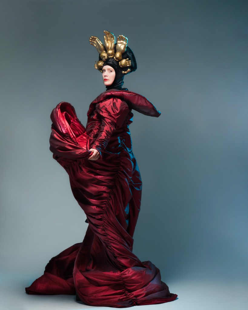 I asked Jimbo to design an over-the-top goddess costume for me for a GRAND ENTRANCE to the show. I then promptly take it off to reveal puppeteer’s black clothes—I need to blend into the background so that the puppets pop.