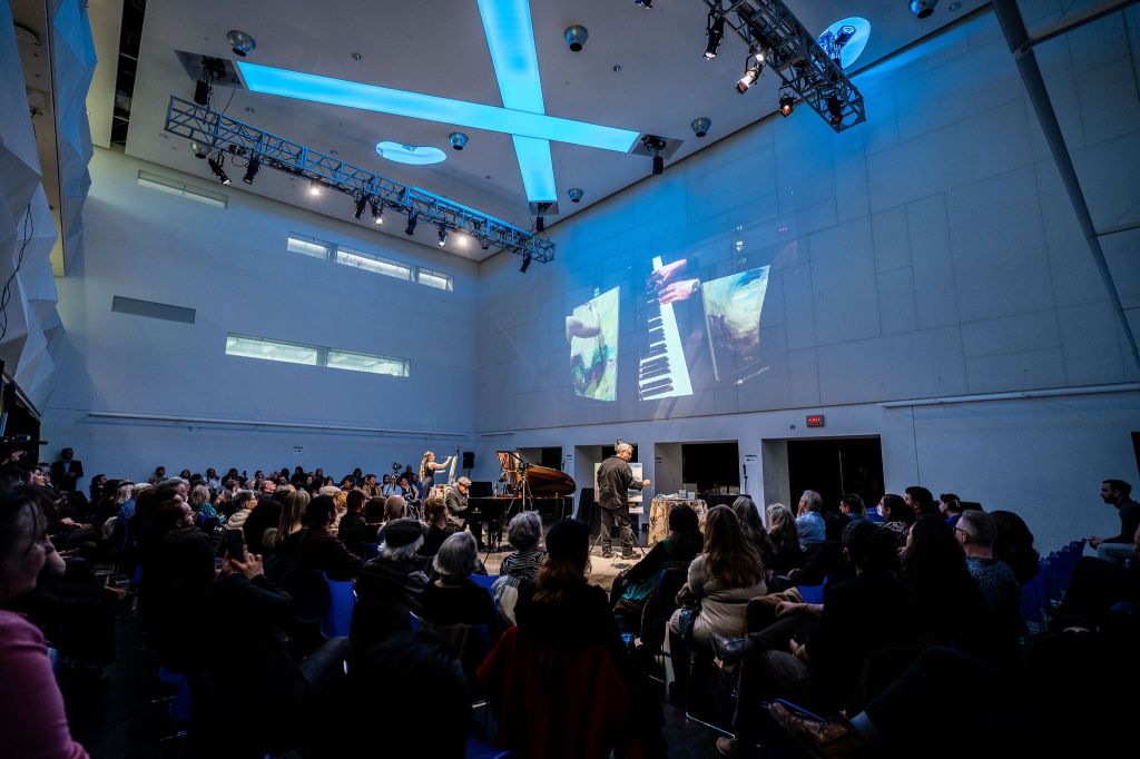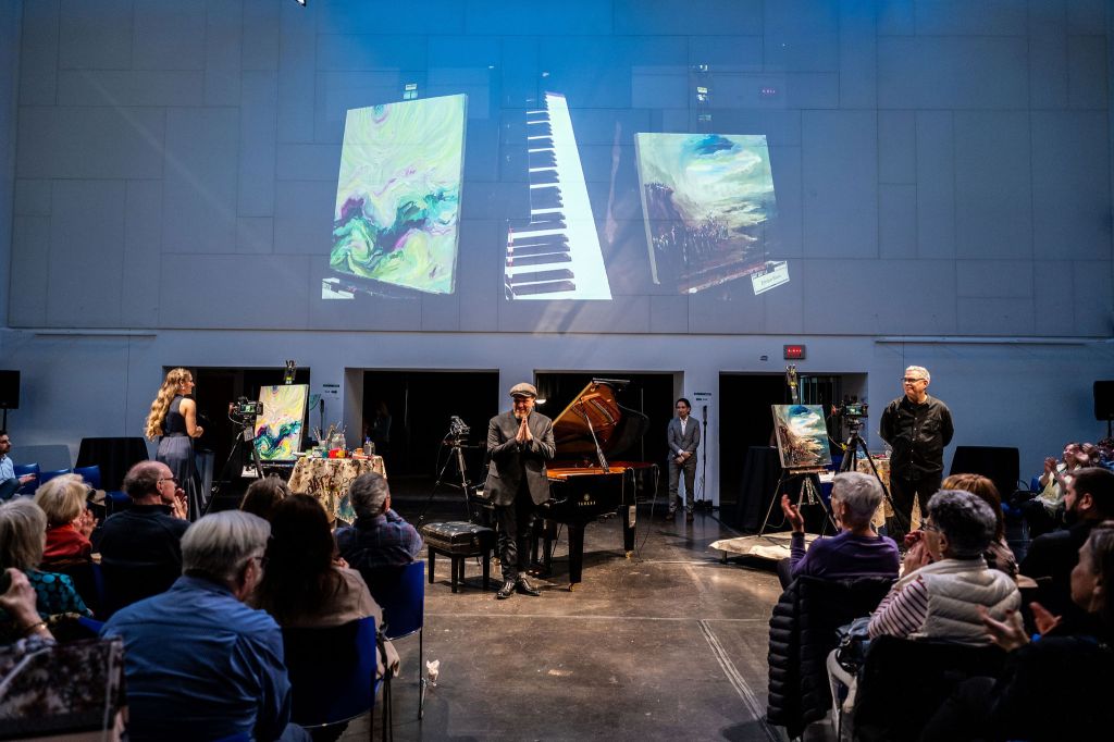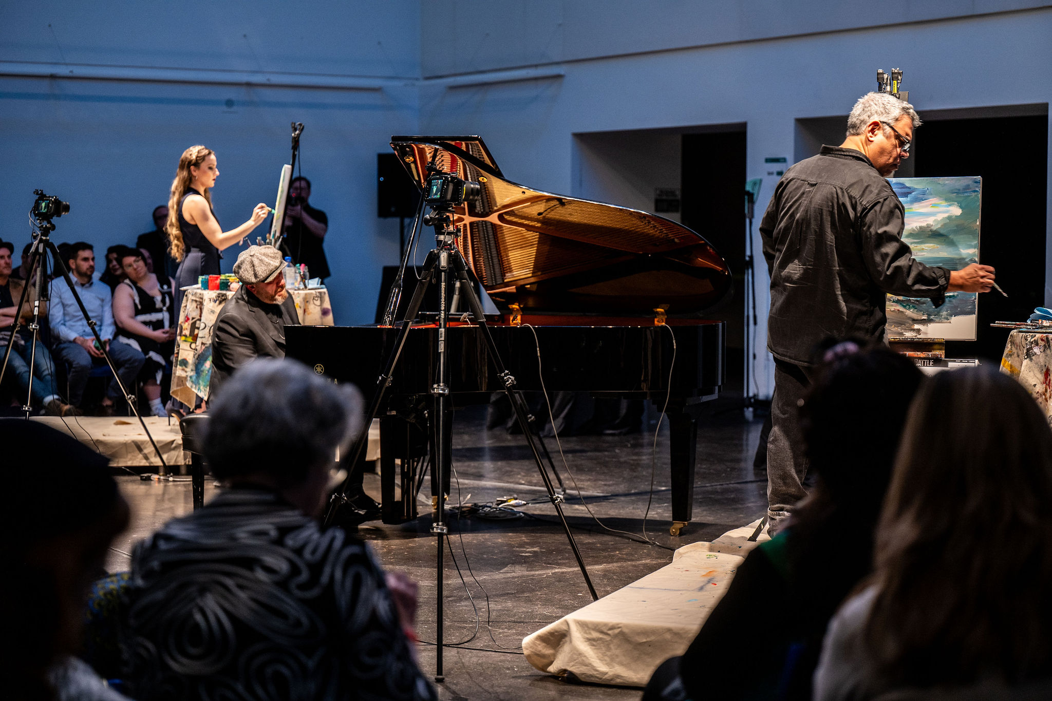 Versus was held in the Great Hall at OCAD U; I was thrilled to finally get to go into such an iconic building on the downtown Toronto skyline. The playing space featured a grand piano in the centre of the room, flanked on either side by a raised platform with a canvas and supplies on each one. The audience was sat in a horseshoe around the room, ensuring you could see at least one canvas. The use of projection for this performance was perfect; having set up a camera over the shoulder of both visual artists as well as over the piano, you could look up onto the wall and see all three artists creating simultaneously. It was awesome to be able to go back and forth between watching the easel immediately in front of you to seeing how everything was developing together.
