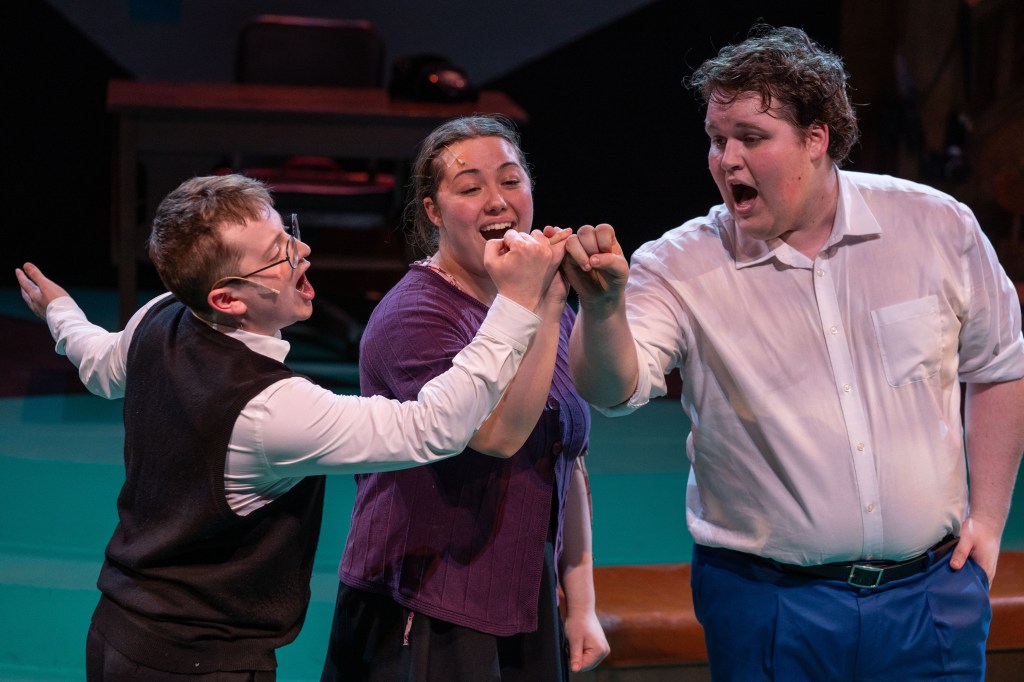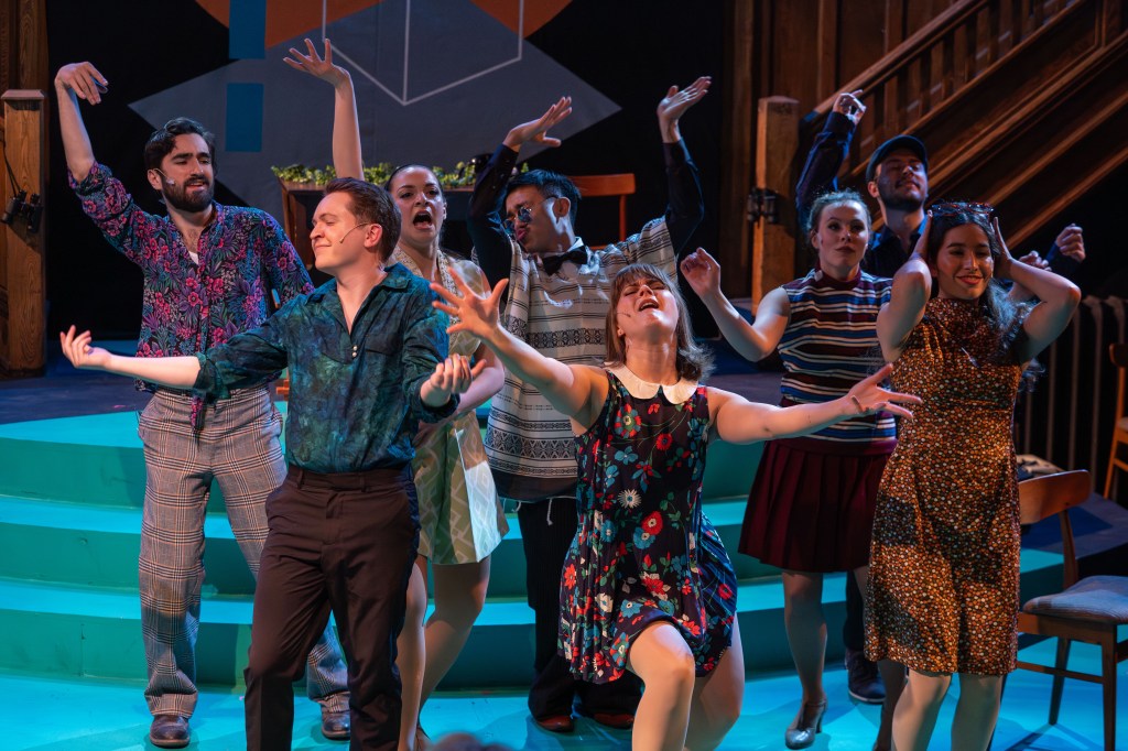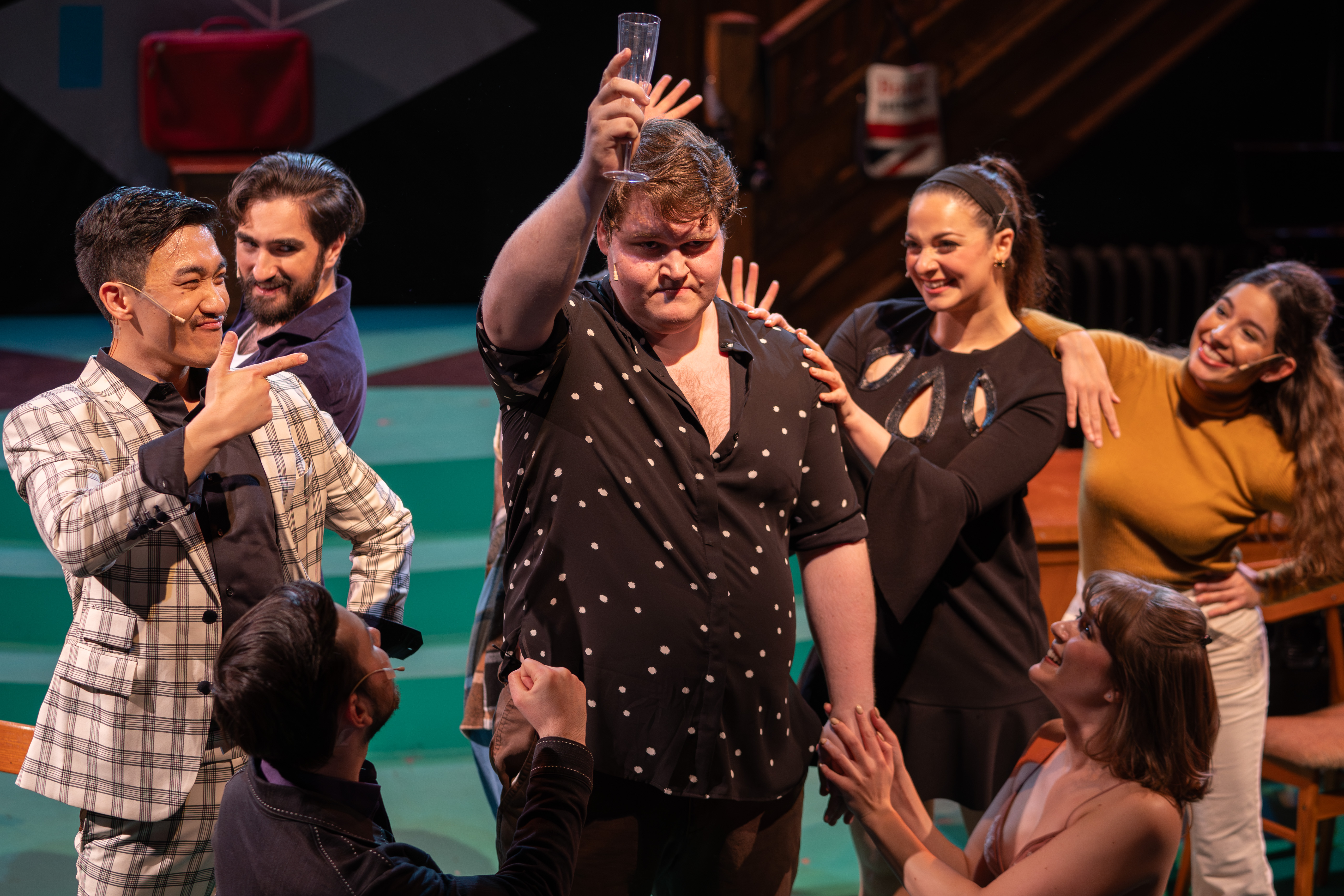 The cast of Merrily We Roll Along is impressive; this show was written with a young cast in mind but doesn’t hold back from difficult topics and Sondheim’s demanding scores, yet this cast deftly handles it all. Duncan Lang, Jameson Mosher and Colette Richardson star as Franklin, Charley, and Mary. Their chemistry with one another is electric, and that powers the performance forward. Mosher’s performance of the song “Franklin Shepard, Inc” brings down the house, while Richardson’s emotional performance of “Not a Day Goes By – Reprise” brought a tear to my eye. Lang gives a heart wrenching performance throughout the play, hardly spending more than a few moments off-stage. Azaria Shams and Evan Sokolowski shine as Gussie and Joe, the starlet and her producer husband; they are truly a delight to watch. Sydney Gauvin gives such a moving rendition of “Not a Day Goes By” I thought my heart would burst; she’s got a powerhouse voice inside that petite frame! The ensemble is compromised of Ian Kowalski, Dallas Brinkman, Jessica Rosales, Randy (Lei) Chang, Flynn Cuthbert, Jada Rifkin, Mona Hillis, and Oliver Daniel. As the “it crowd” that Franklin eventually belongs to, along with several other interesting personalities he meets along the way, they tackle the tight choreography with grace and bring unique qualities to each of their characters.