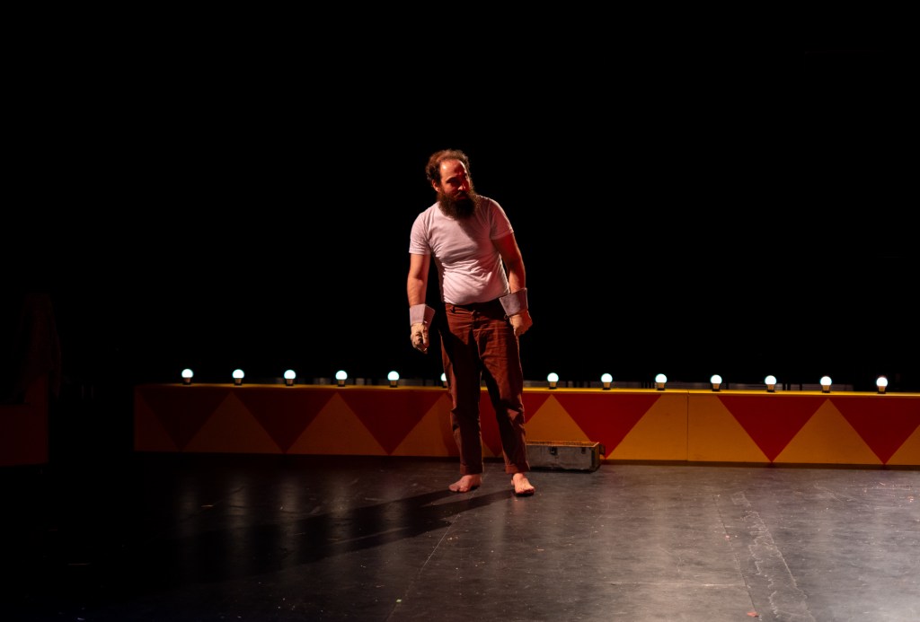 Kris Van Soelen and Nicole Wilson’s set design instantly transports the audience to the centre ring at a circus; the iconic yellow and red triangles with the bare lightbulbs on top are a clear indication of where their inspiration has come from. The other sets being on the moving platforms is very well done; it allows for them to haul out the pieces as needed, while also being able to tuck them away in the corners of the room and use the full performance space.