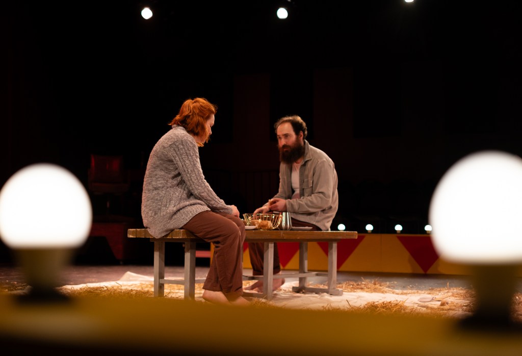 Dead Elephants is told by three very talented actors whose performances shine just as brightly as the lightbulbs around the stage. Hayden Finkelshtain and Nicole Wilson are our guides throughout the play, and deliver outstanding performances. The emotional depths they reach as the grieving parents is astonishing and truly felt like the heart of the play. I also really liked the camaraderie and chemistry they had as they portrayed the French soldiers; the final scene of that plot line was a tear-jerker as well. However, Allan Cooke’s performance as the pigeon practically stole the show. His movements combined with his costuming so perfectly imitated those of a pigeon it was almost unnerving. I adored the grandiosity he endowed into this character, making him terrifying, verbose, and delightful.