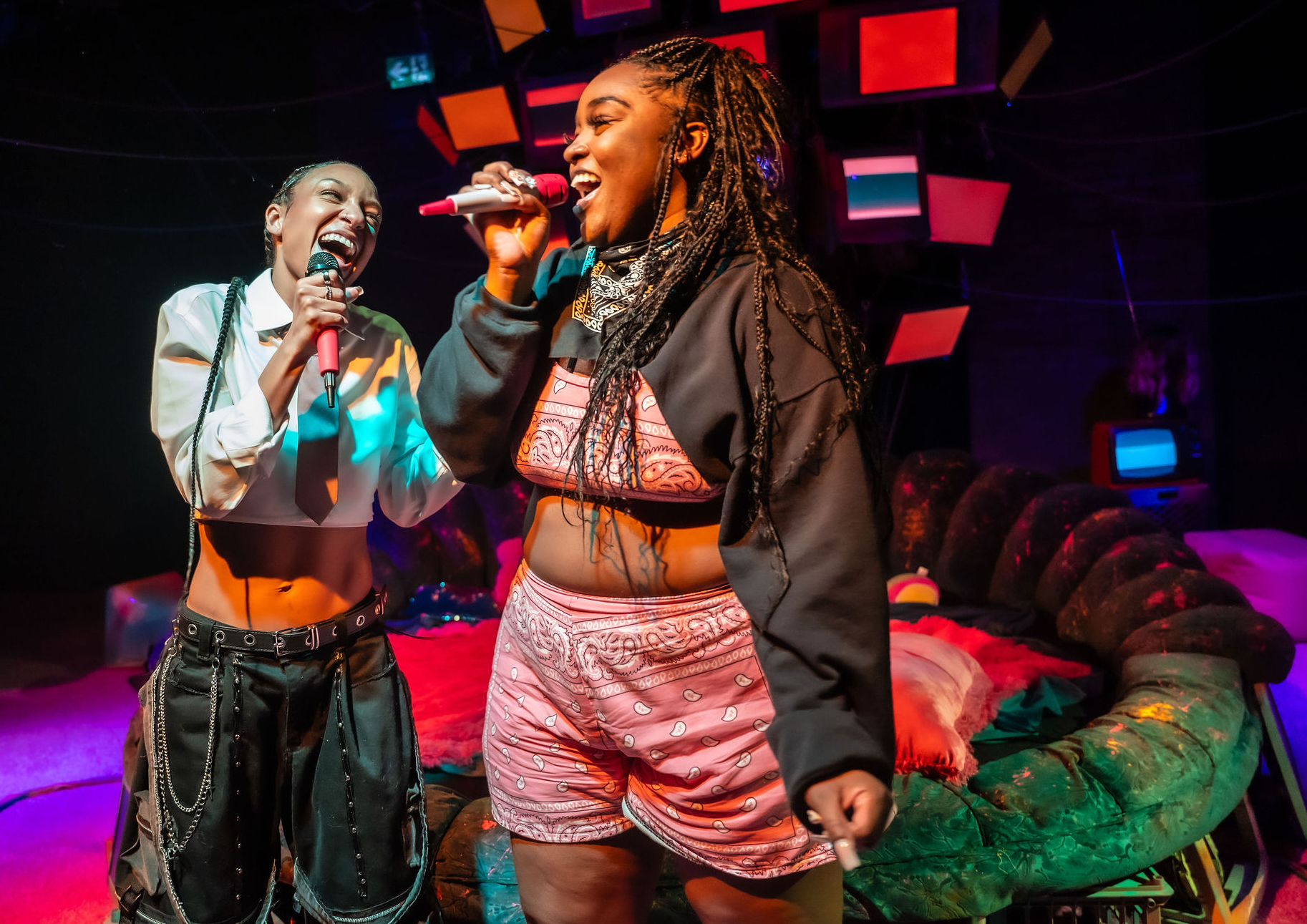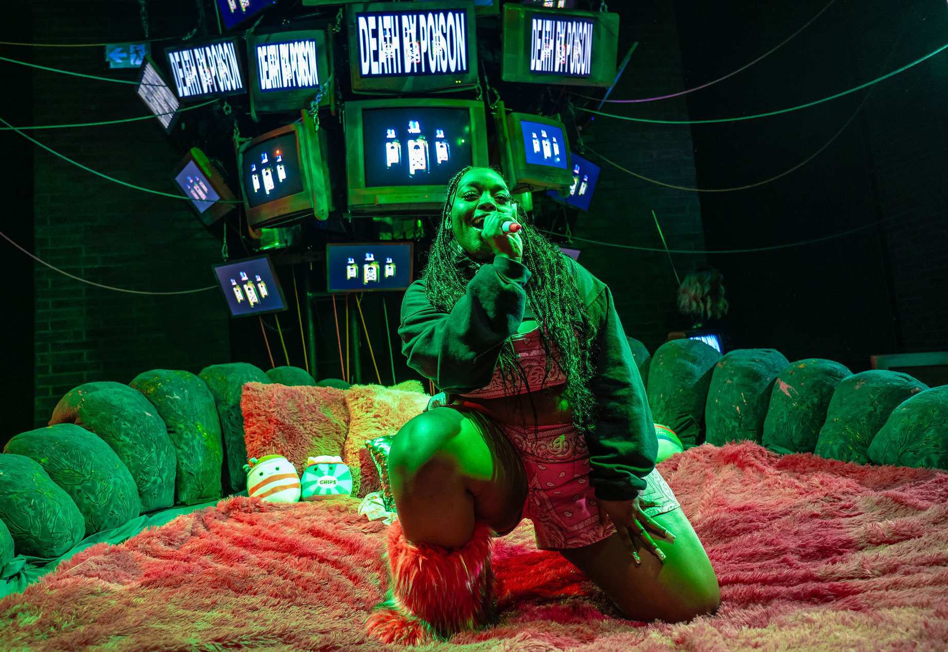 The design team behind seven methods of killing kylie jenner have created this incredibly dystopian and cyberpunk landscape for the characters to exist in. Nick Blais’ set design includes functional screens scattered around the room, along with a cluster along the back wall which looks like a hive of screens and images. The trampoline bed is fabulous; I love all of the pink fuzzy pillows and blankets (Cleo and I have similar taste it seems!). Laura Warren’s video design, Maudie Bautista’s sound design, and Christopher-Elizabeth’s lighting design create the technologically driven world these characters live in. Des’ree Gray’s costumes are unique and vibrant, capturing the essence of the characters through their clothes.