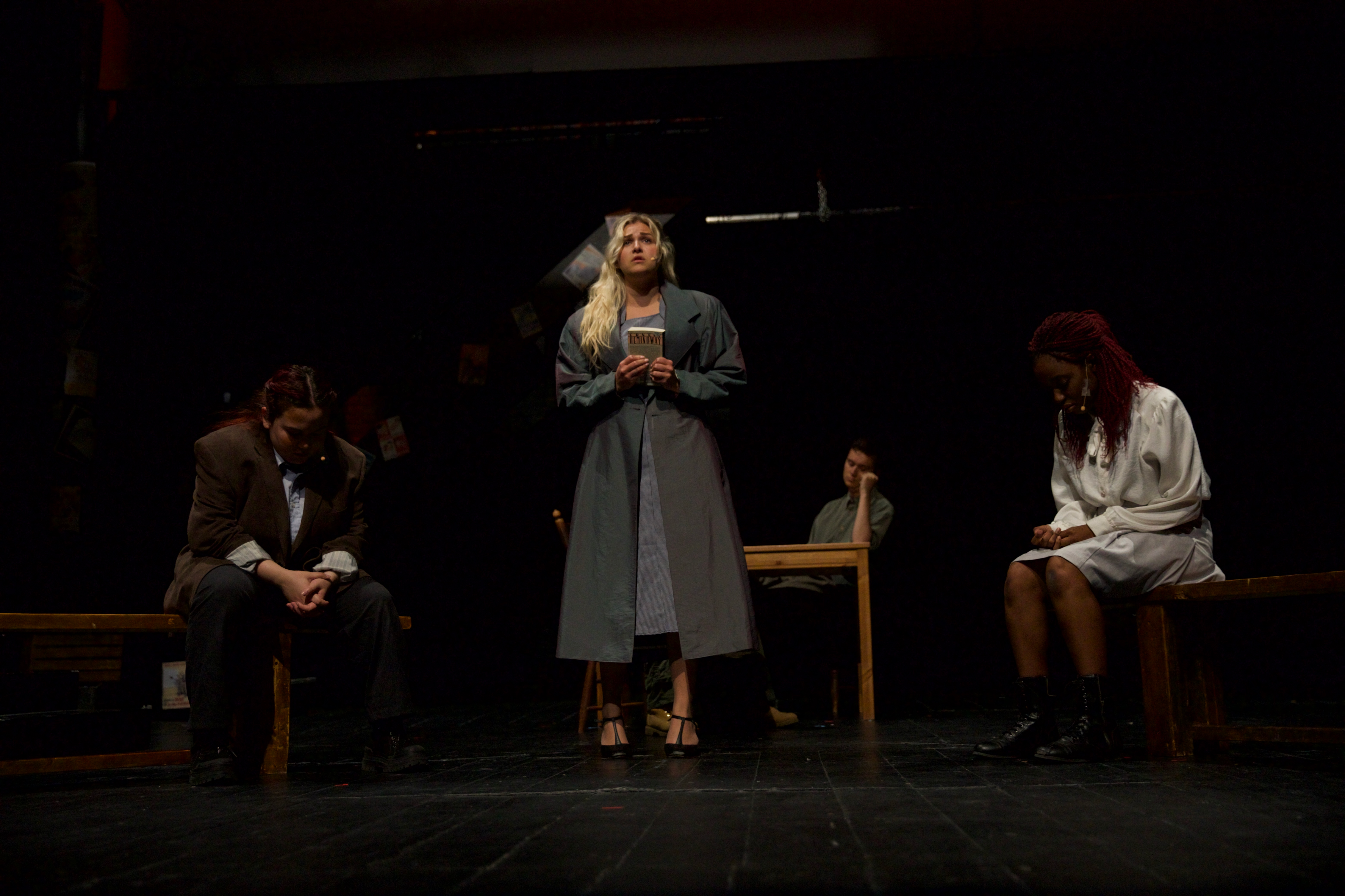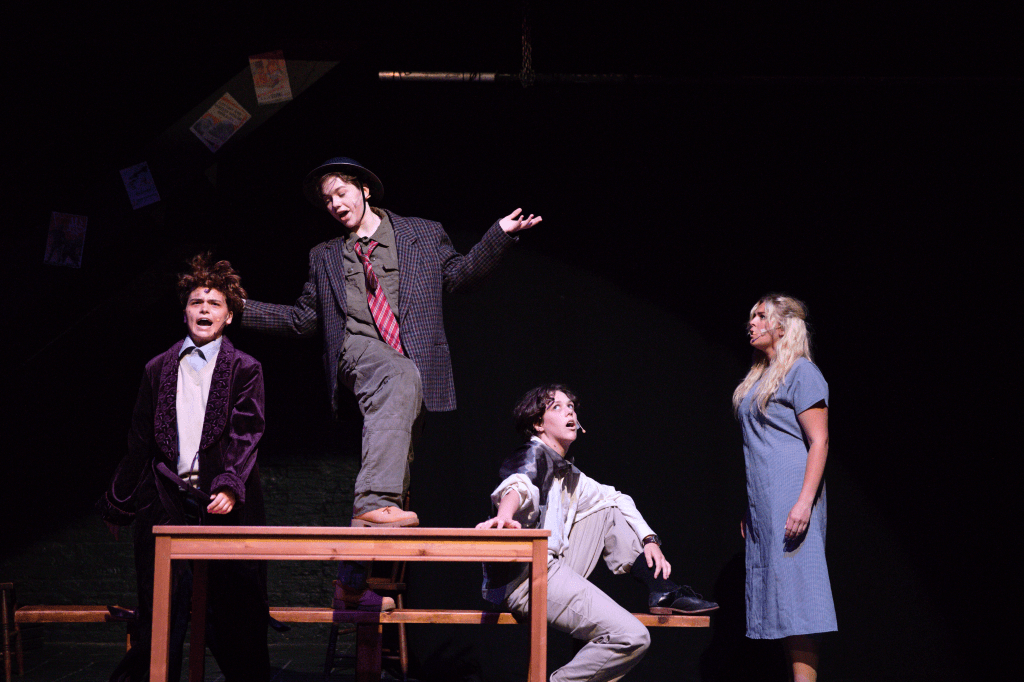 Montserrat Cadena’s set design was simple and meaningful; the posters covering the walls were full of warnings and war propaganda, visually placing us within the time period. The simple benches and tables were then able to be manipulated to create all of the locales required to tell the story. Cameron Ashley’s costume designs allowed us to differentiate the characters in Wonderland from their British counterparts, while also keeping with familiar colour palettes and styles.