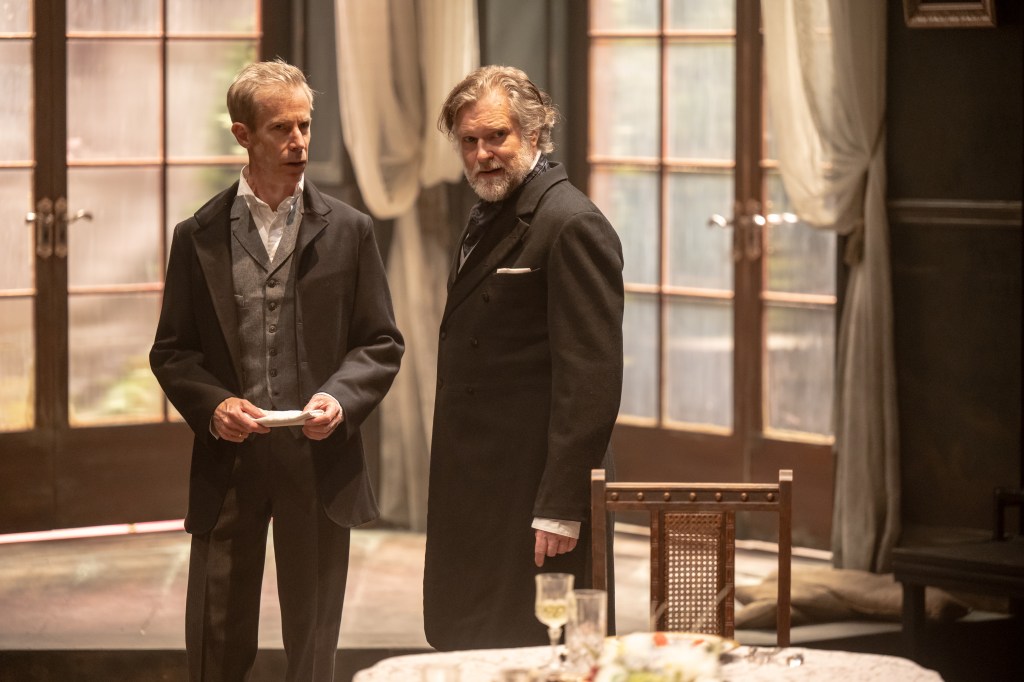 Upon entering the Guloien Theatre, you truly enter into Rosmersholm: you stop in a foyer complete with a full umbrella stand, mirror, and chandelier before entering into the main room of the house. Portraits of Rosmers past line the walls with small oil lamps to illuminate them. The smell of the wood flooring immediately hits, adding to the antique and rich environment. Large bay windows take up one corner of the space, with mirrors strategically placed on the opposing wall to allow the audience to take in every moment of the production. Joshua Quinlan has outdone himself with this set; the attention to detail, the verisimilitude it allows for, and the overall aesthetic is beyond anticipation. Ming Wong has created exquisite costumes for these characters to live in. They carry the personalities of their wearers perfectly as well as being indicative of the time of the piece. Kimberly Purtell’s lighting design is impeccable, creating the deep shadows and bright boarders of various spaces as they needed to change, giving that foreboding ambiance its edge. The sound design of this production is imperative, and Thomas Ryder Payne expertly rises to the occasion. The final moments of the play are full of anticipation. Waiting, shoulders rising, for the moment you know you’re going to hear: the sickly crunch Rosmer’s already described. When it comes, you can’t help but wince.