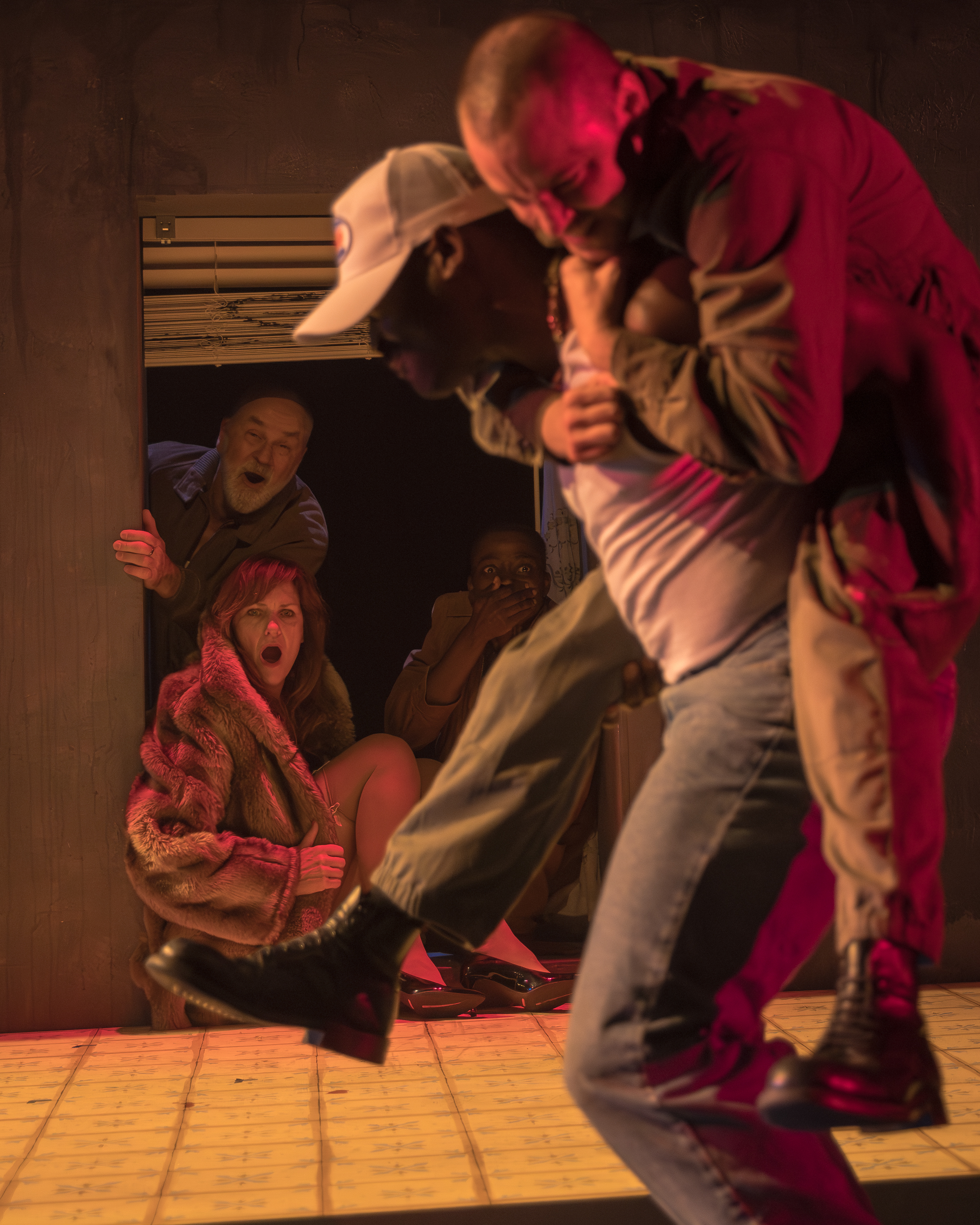 The performances given in Roberto Zucco are nuanced, vulnerable, and powerful all at once. Jakob Ehman stars at the titular character, bringing a calm ease to the violent murderer. Ehman’s charisma is undeniable, and he makes Zucco a likeable character despite his actions. Samantha Brown plays a young lady who falls for Zucco. Brown’s character is tenacious in some ways and delicate in others, thanks to a shining performance from Brown. The rest of the cast play multiple characters each, filling up the world of Roberto Zucco with fascinating personalities. Daniel MacIvor gives a stand-out performance, particularly as the old man Zucco meets in the subway. Yet his comedic timing is put to good use when he plays the jail guards alongside Oyin Oladejo. Oladejo’s performance as Robin’s sister pulls on the heartstrings, while her saucy Madam is something straight out of a Film Noir. Fiona Highet’s characters are so varied, and yet all of them have a ferocity about them which makes her a memorable member of this ensemble. Kwaku Okyere gives a strength and conviction to his characters which makes the unfathomable things they do somehow feel like the only option.