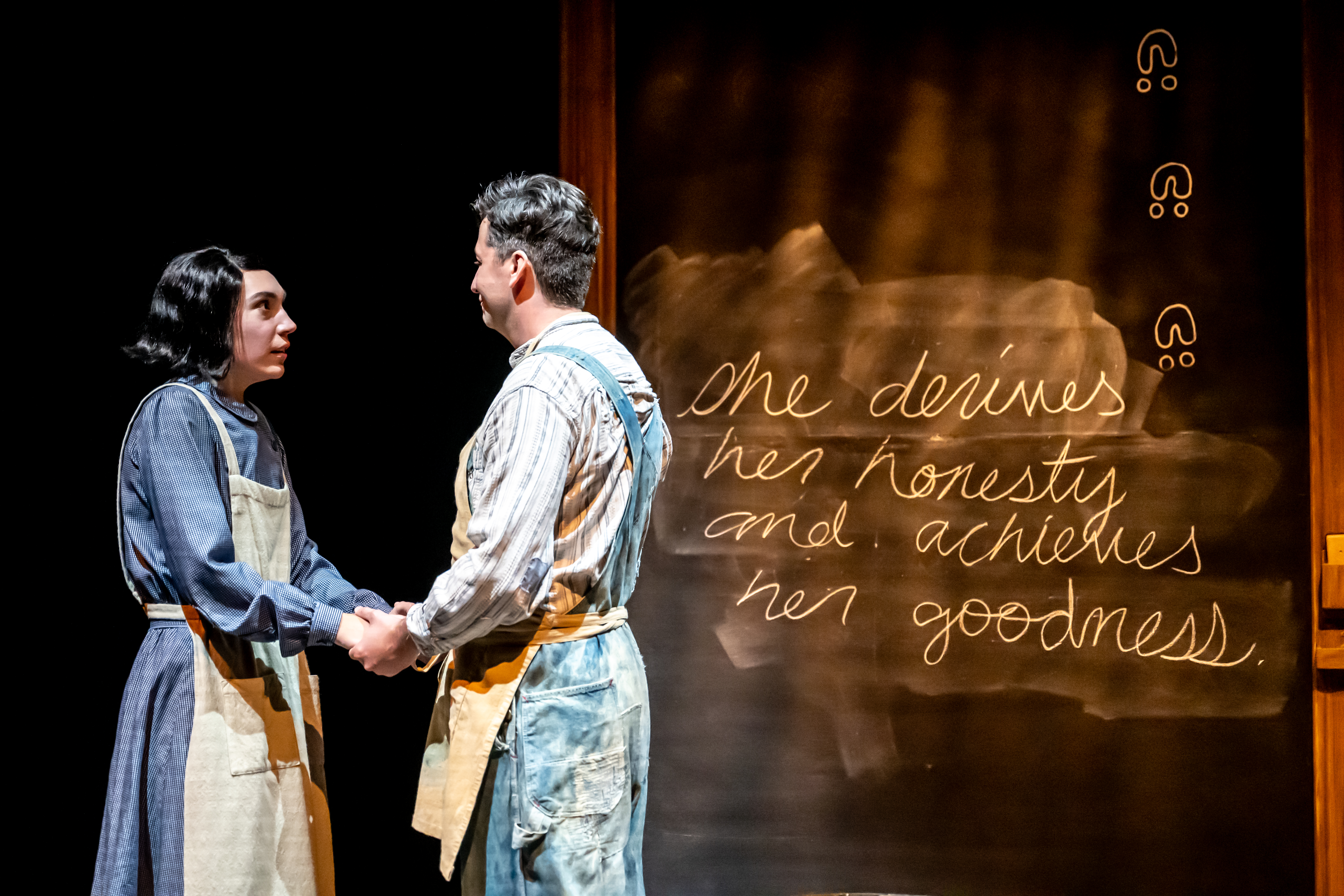 However, the cultural erasure of Indigenous peoples which was perpetuated in these schools becomes the visual focal point of 1939. Three giant blackboards make up the background of Joanna Yu’s set design. Used by student and teacher alike, they become physical representation of the cultural erasure the students face. The nuance and meaning put into each drawing and eventual expunging is fascinating to witness. For example, the students rarely wipe each other’s work off the chalkboards, unless it’s a Shakespearean quote. Those Shakespearean quotes are also exclusively written by Beth, showing her passion for the Bard as well as learning. Joseph shows his concern for the loss of his language by only writing down Anishinaabemowin words, while Evelyne shows her family’s history in medicine by drawing different herbs and plants. Jean writes to his mother, an sign of their deep connection. Yet time after time these words and pictures are wiped away, more frequently by Father Williams than Miss Ap Dafydd.