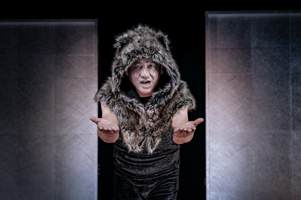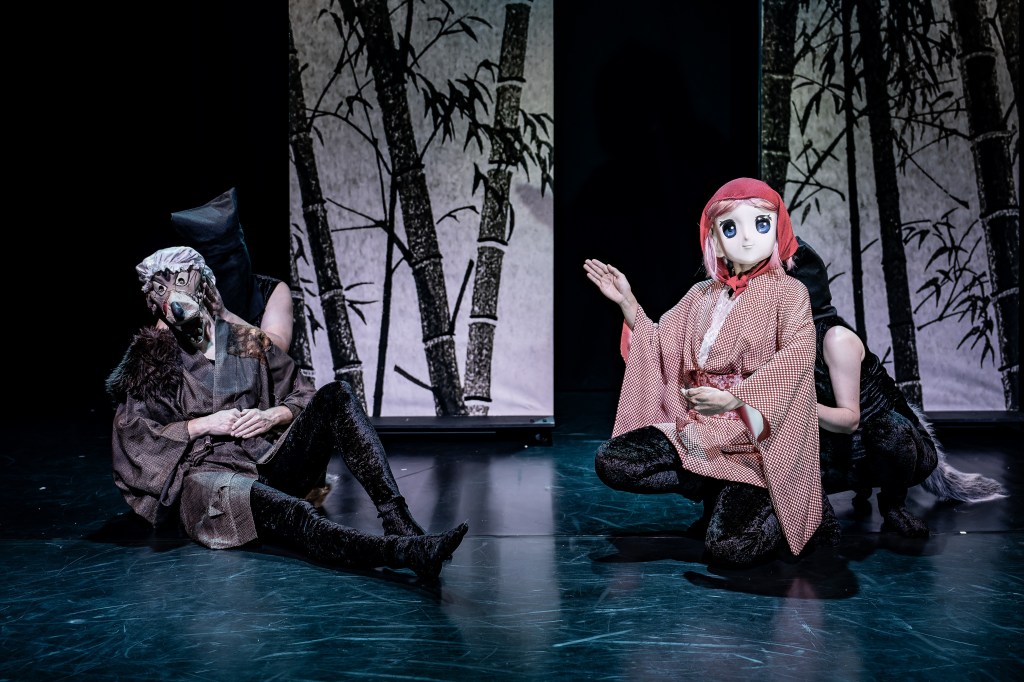 The ambiance which the design team has created for this production is entirely ethereal, the ideal environment for the telling of fairy tales. Yang Becker’s set and lighting design are the first design elements we encounter in the space. Three panels of a wall, decorated as if we’re in a forest of bamboo, are the only set pieces used throughout the production. Their simplicity allows them to be many things and many places, even a fireplace. Anika Johnson’s sound design ranges from eerily haunting as the wolves growl, to a peppy J-pop number to close out the talk show. The use of traditional Japanese music between scenes ties the piece together artfully. Atsuko Kiyokawa’s costumes are dazzling, showing everything from traditional to modern, Kawaī to menacing. A highlight is certainly the white kimono which is worn by the crane in “The Crane Wife,” it’s a stunning antithesis to the dark costumes the performers wear as a base, and as wolves, throughout.