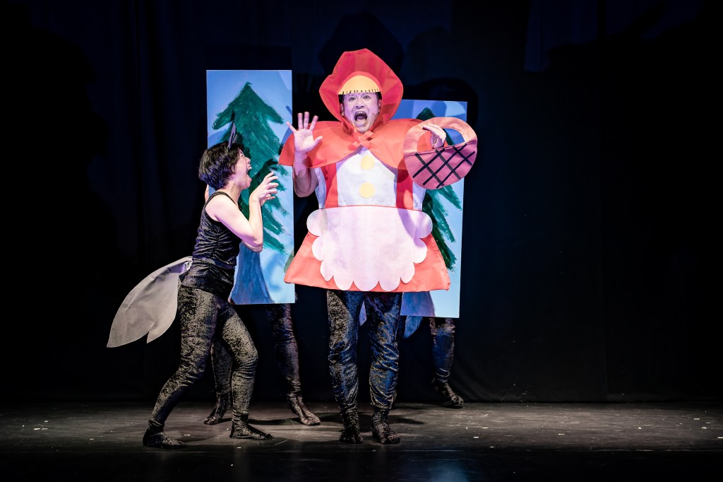 Mukashi, Mukashi, which is Japanese for “once upon a time,” is a telling and re-telling of “Little Red Riding Hood” as well as the Japanese tale “Tsuru Nyōbō” or “The Crane Wife.” Using several Japanese theatrical traditions and techniques to tell the stories, Mukashi, Mukashi gives unique and exciting perspectives to a familiar tale. There’s a “live” talk show where Grandma and Little Red are confronted by Mrs. Wolf, and a telling using performers as life-size puppets along with a Kabuki samurai as the woodsman who saves the day, just to describe a few. Then there’s the stories of the crane, which are elegantly performed using movement and dance. The play begins with four wolves howling at the full moon, and ends with four cranes flying in the light of that same full moon; a beautiful symmetry which perfectly encapsulates the heart of the production.