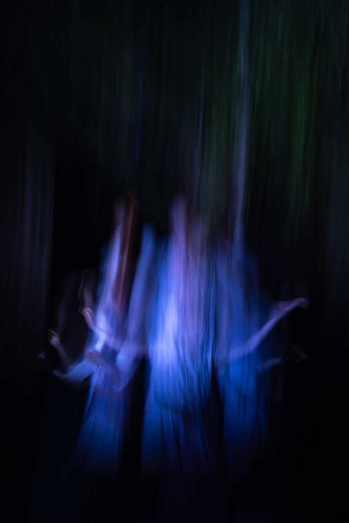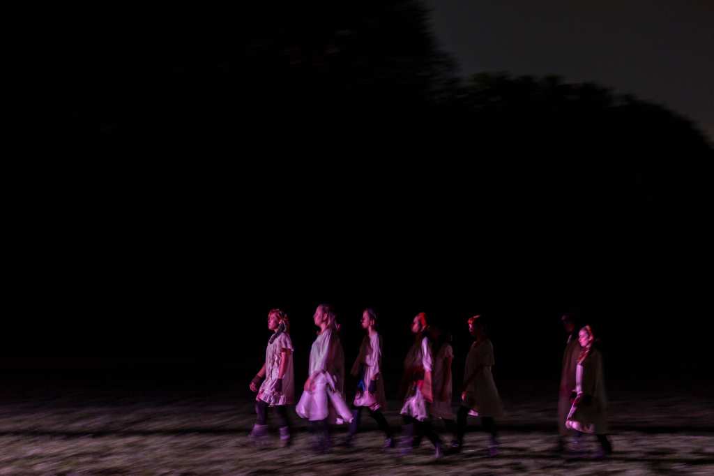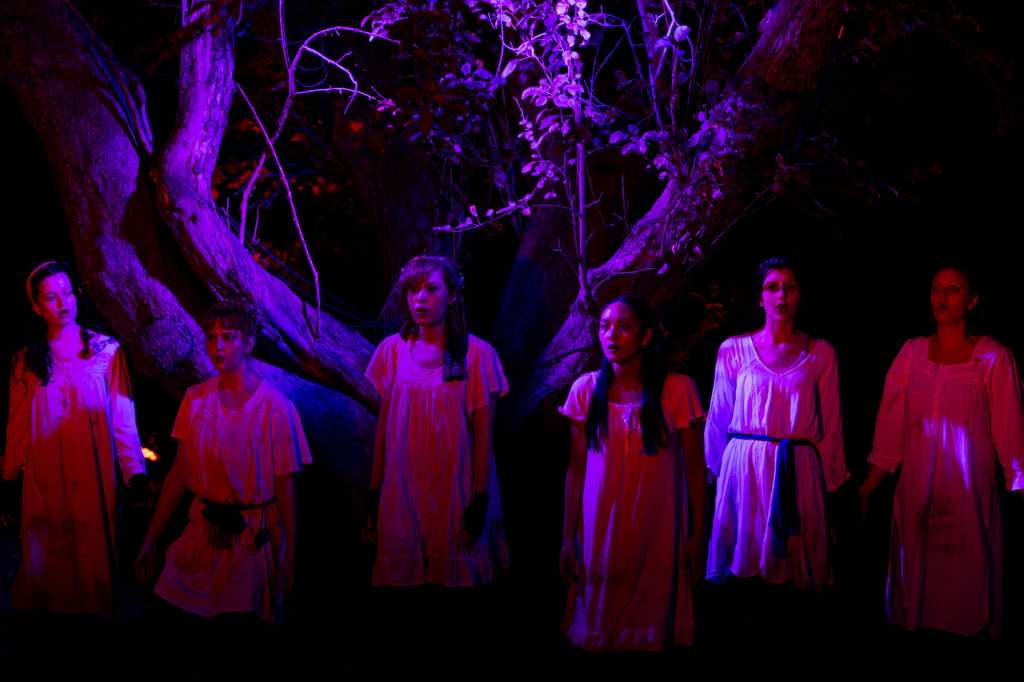 Playwrights Kathleen Welch and Natalia Bushnik star as Prava and Miha in SAMCA. There is something unique about watching performers give life to their own creation; they know these characters from the inside out because they put all of that hard work into making them from the ground up. The passion and understanding which is clearly evident in Welch and Bushnik’s portrayals of their characters is a testament to the time they’ve spent with these women and their story. They are supported by Andra Zlatescu, Madeline Elliott Kennedy, Jenna Geen, Camila Farah, Sydney Nicholson, Elif Coskun, Beatrice Kwan, and Fae Alexander. This incredibly talented ensemble are the Zâne, and act as a sort of Greek chorus for the play. Zlatescu and Alexander are the musicians formerly mentioned, and the rest of the ensemble joins them as an ethereal choir. All of them expertly execute Skye Rogers’ spookily beautiful choreography, using their bodies as well as the text to tell this story; their entrance in particular will haunt your nightmares!
