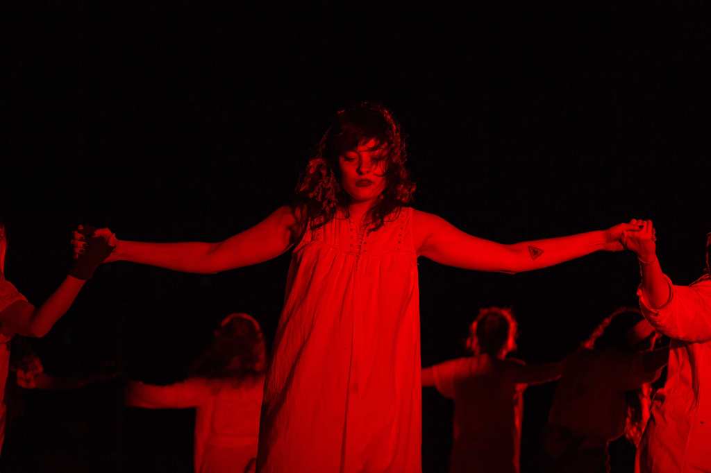 This chilling story is infused with original compositions by co-author Kathleen Welch. The harmonies sung by the ensemble of Zâne, along with live guitar, banjo and saw playing, the musical soundscape for SAMCA greatly enhances the atmosphere of the production. Beginning with terrifying, guttural, animalistic noises and then into Welch’s powerful score; this is the glue which holds both the ambiance and the ethos of the piece together.