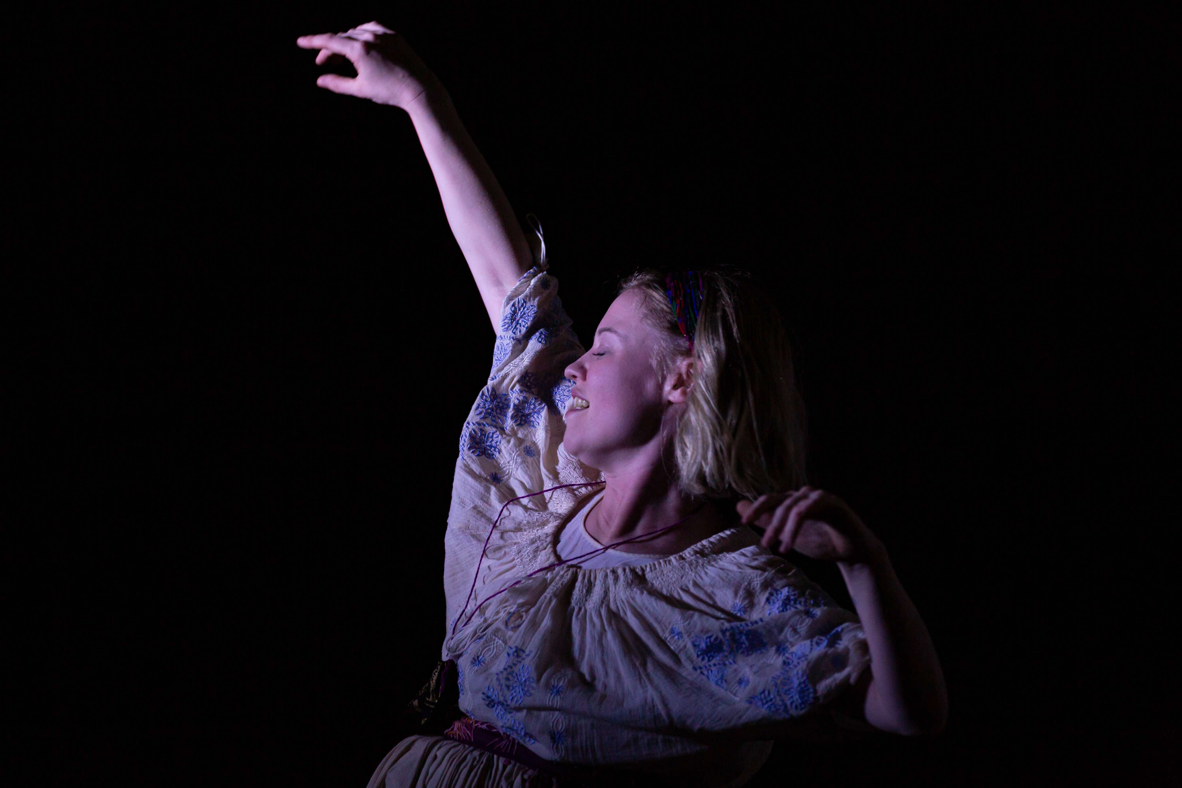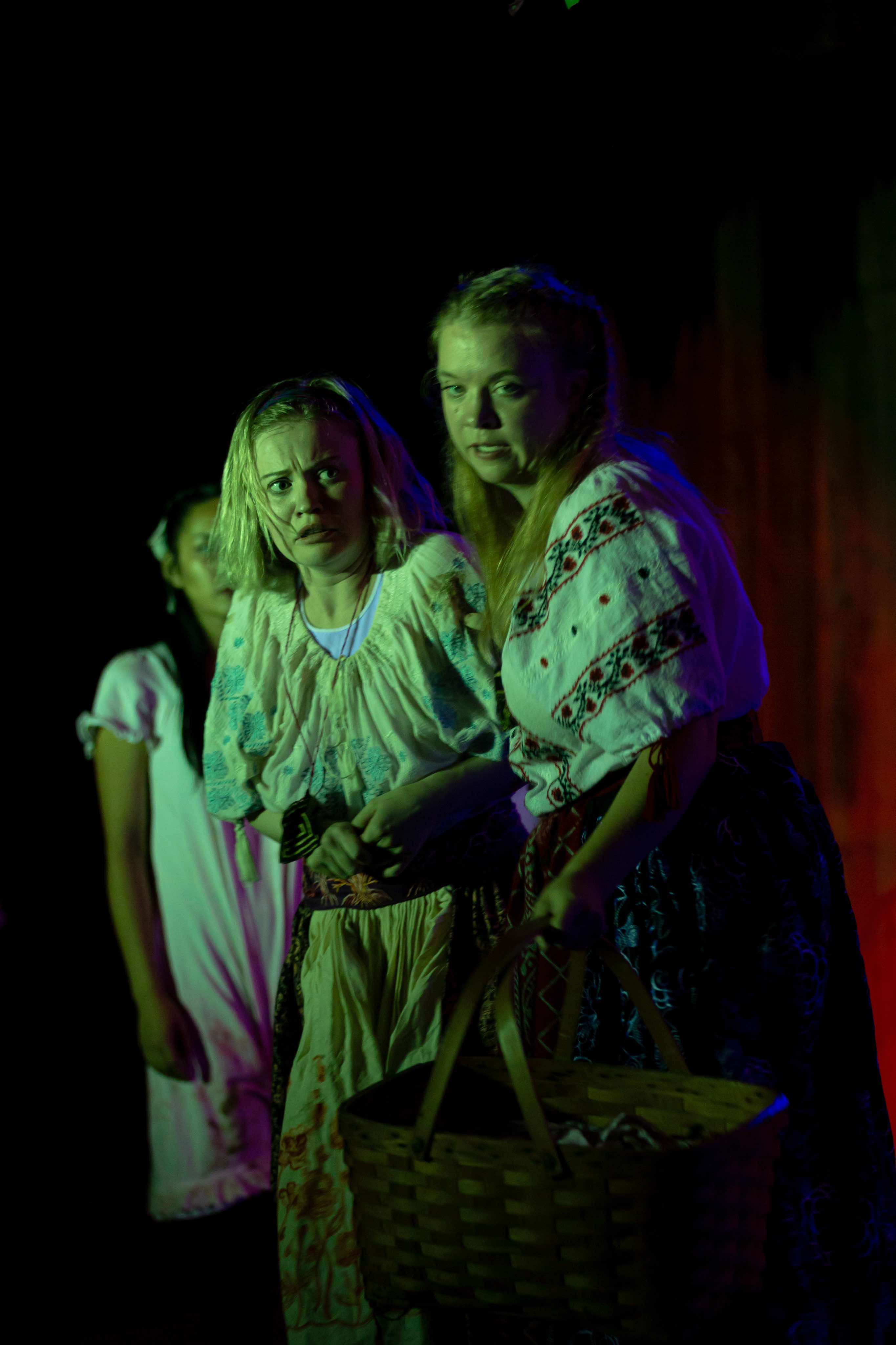 Playwrights Kathleen Welch and Natalia Bushnik star as Prava and Miha in SAMCA. There is something unique about watching performers give life to their own creation; they know these characters from the inside out because they put all of that hard work into making them from the ground up. The passion and understanding which is clearly evident in Welch and Bushnik’s portrayals of their characters is a testament to the time they’ve spent with these women and their story. They are supported by Andra Zlatescu, Madeline Elliott Kennedy, Jenna Geen, Camila Farah, Sydney Nicholson, Elif Coskun, Beatrice Kwan, and Fae Alexander. This incredibly talented ensemble are the Zâne, and act as a sort of Greek chorus for the play. Zlatescu and Alexander are the musicians formerly mentioned, and the rest of the ensemble joins them as an ethereal choir. All of them expertly execute Skye Rogers’ spookily beautiful choreography, using their bodies as well as the text to tell this story; their entrance in particular will haunt your nightmares!