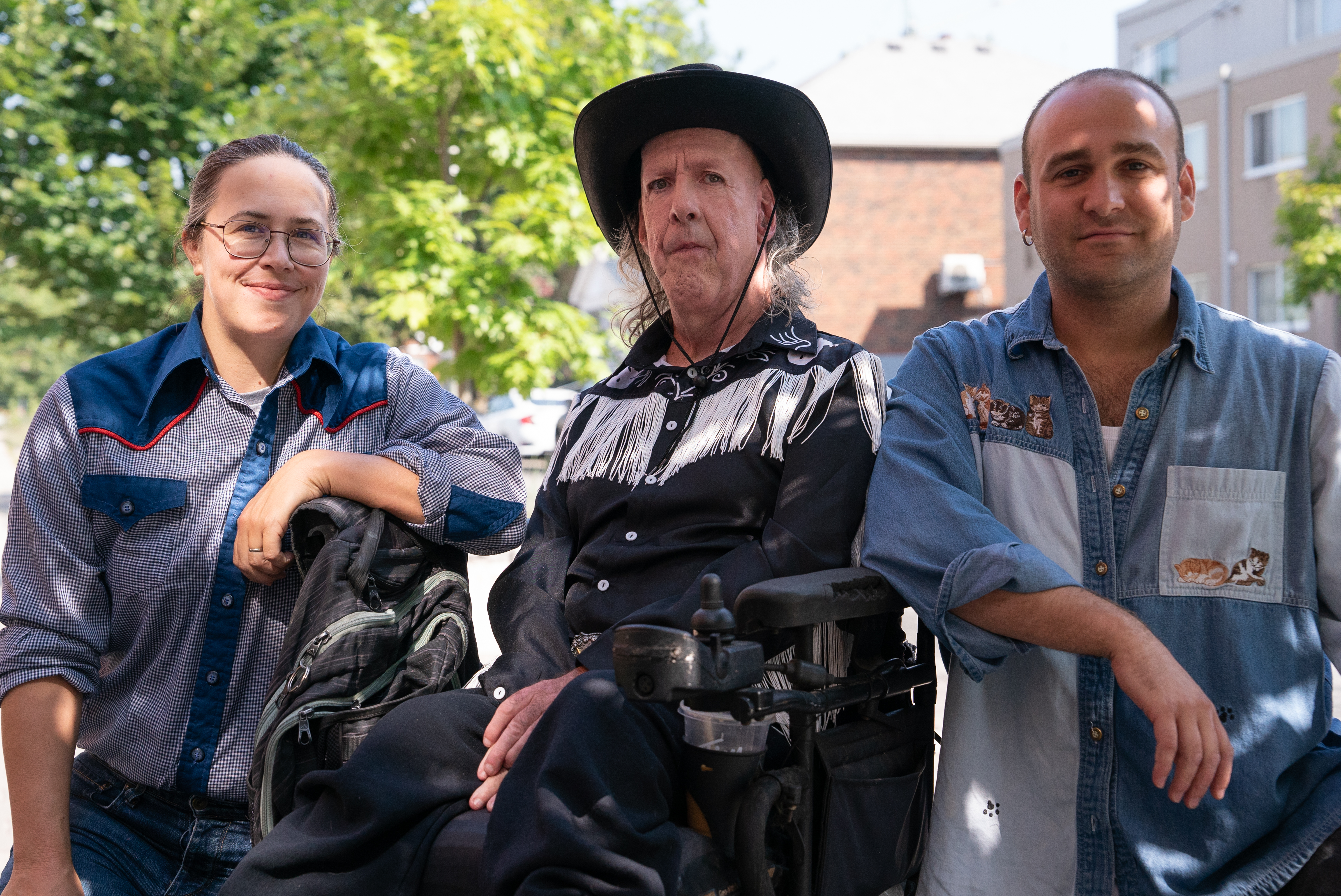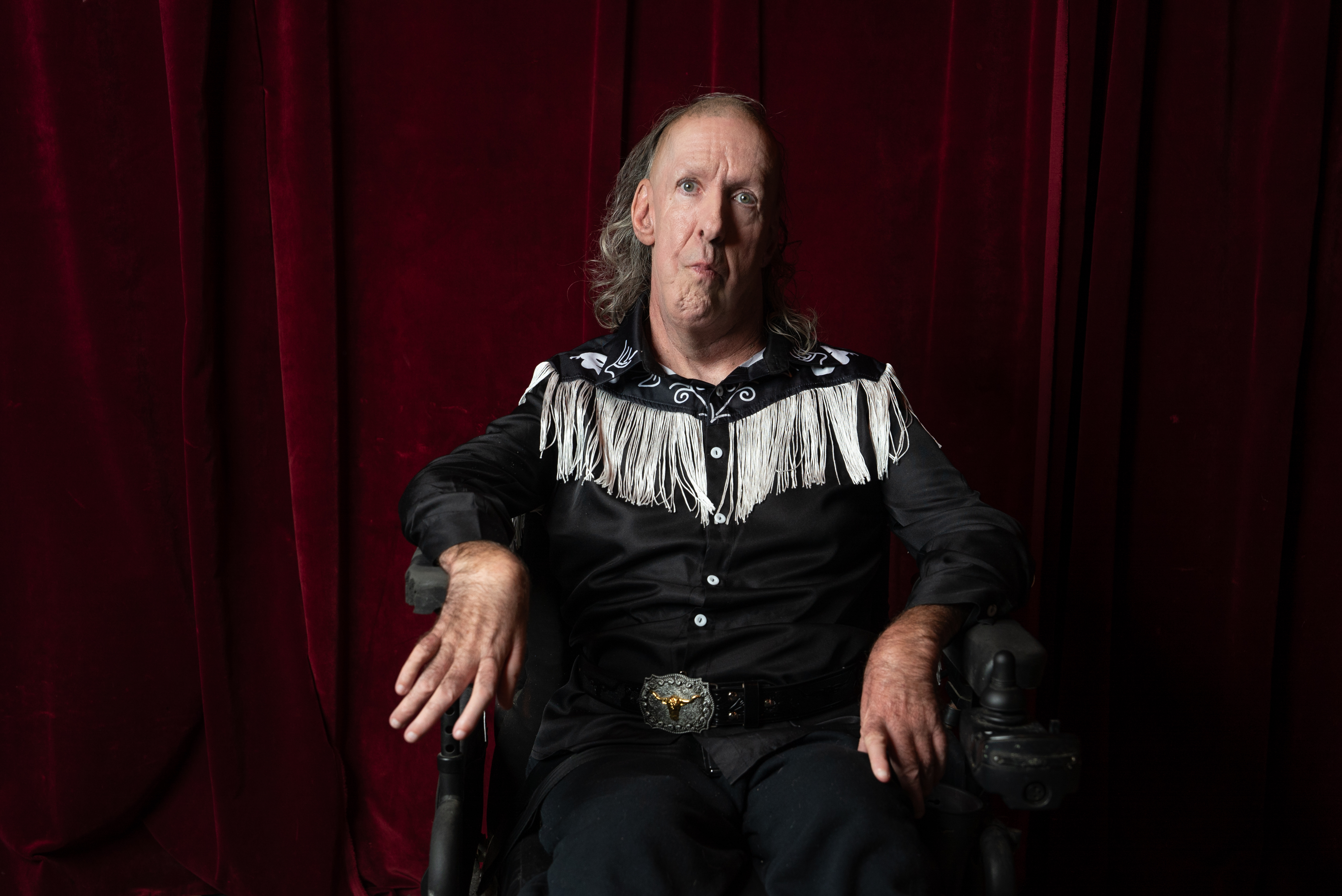 My name is Ken Harrower (The Flin Flon Cowboy). I am sixty-three, I am white, and I use a powerchair to get around. I have been in a powerchair since 1984, before that I was in a manual chair. The Flin Flon Cowboy is based on my life growing up in the foster care system in Manitoba until I turned eighteen. My story is about my life growing up disabled and gay and how I’ve had to learn to maneuver those parts of my life and trying to fit in. I helped co-write the script and the songs. The songs I wrote with Johnny Spence. The script I wrote with Erin Brandenburg and a bit with Dan Watson, Dan helped with Act 1 and got it all started before Erin joined.