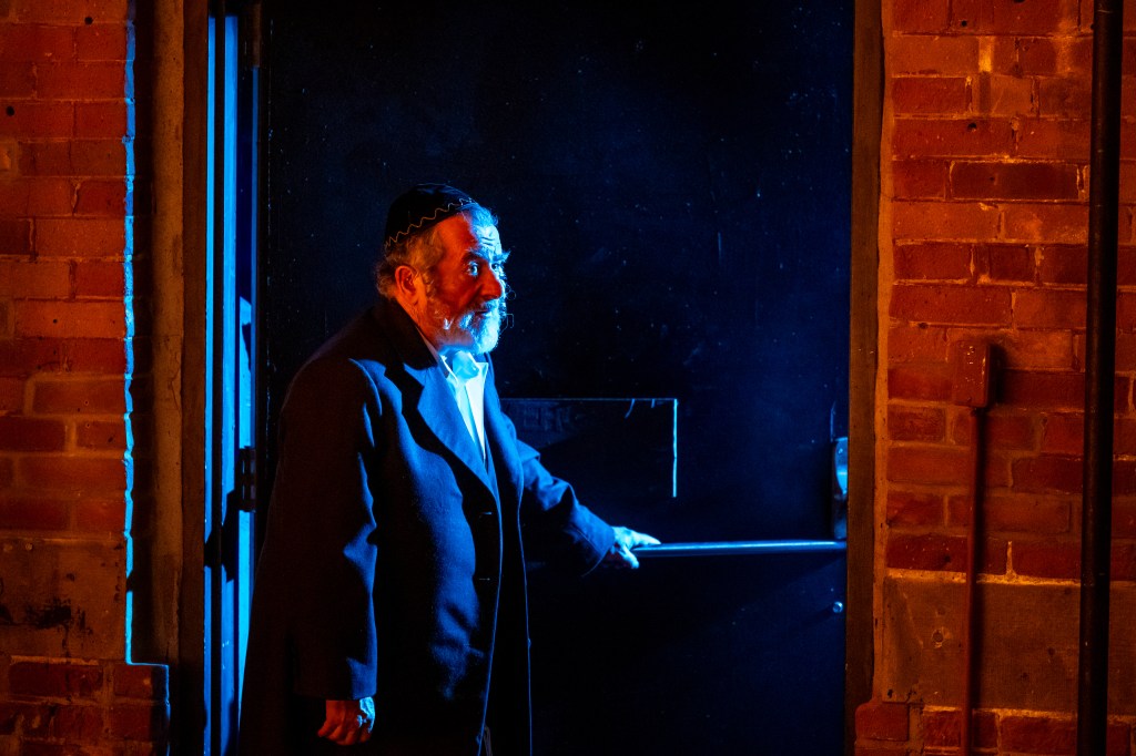 Shawn Kerwin’s set design is breathtaking; I now desperately want to see a production of The Merchant of Venice on this exact set. A massive outline of a cross looms heavy over the stage, with a small piece of it broken, like the destroyed wall behind it. The crumbling wall has the word JEW in huge capital letters on either side of the main backdrop, which consists of another wall with a large crack in it. This fractured backdrop is perfectly emblematic of the fractures in society which we see in Merchant and which Rubinek discusses in this production.
