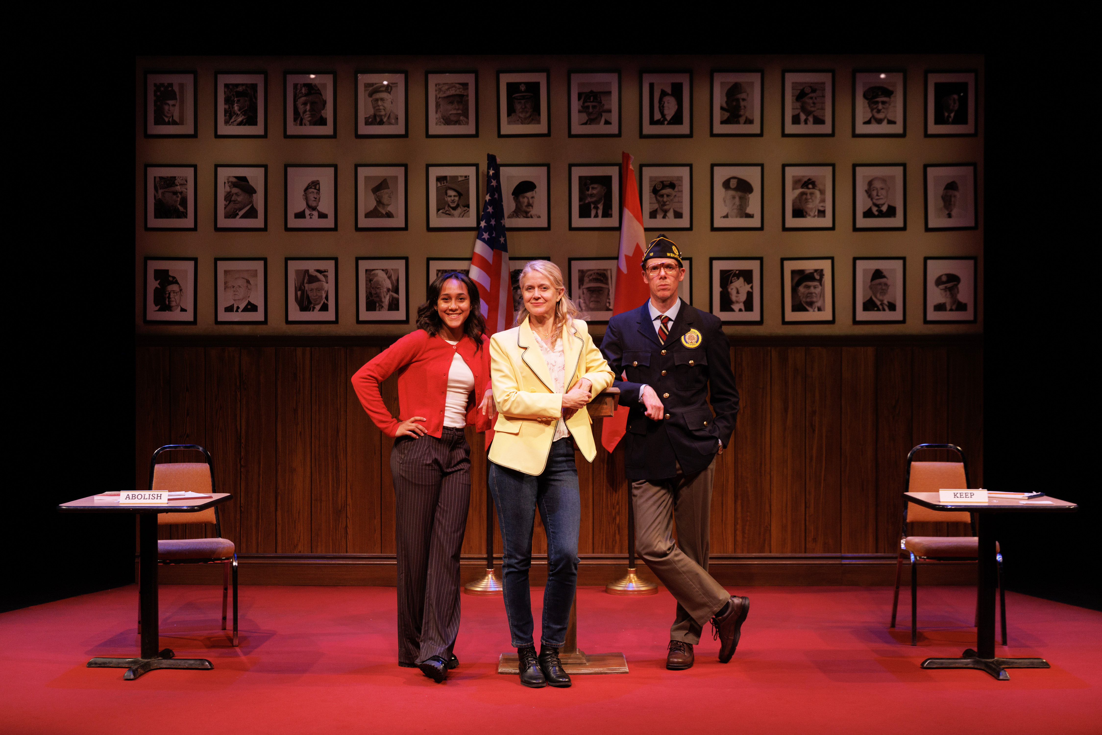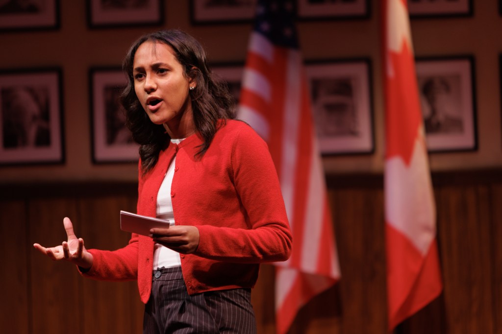 Written by Heidi Schreck and directed by Soulpepper’s Artistic Director Weyni Mengesha, What the Constitution Means to Me begins with a look at Heidi’s teenage years: Schreck funded her college education by traveling around the US debating other high schoolers about the Constitution. The set is designed to resemble a legion hall like the ones Schreck competed in: the wall lined with old photos, an American flag proudly in the centre of the room along with a podium and some chairs to complete the scene. The American flag is later joined by a Canadian one once the focus shifts to our Charter.