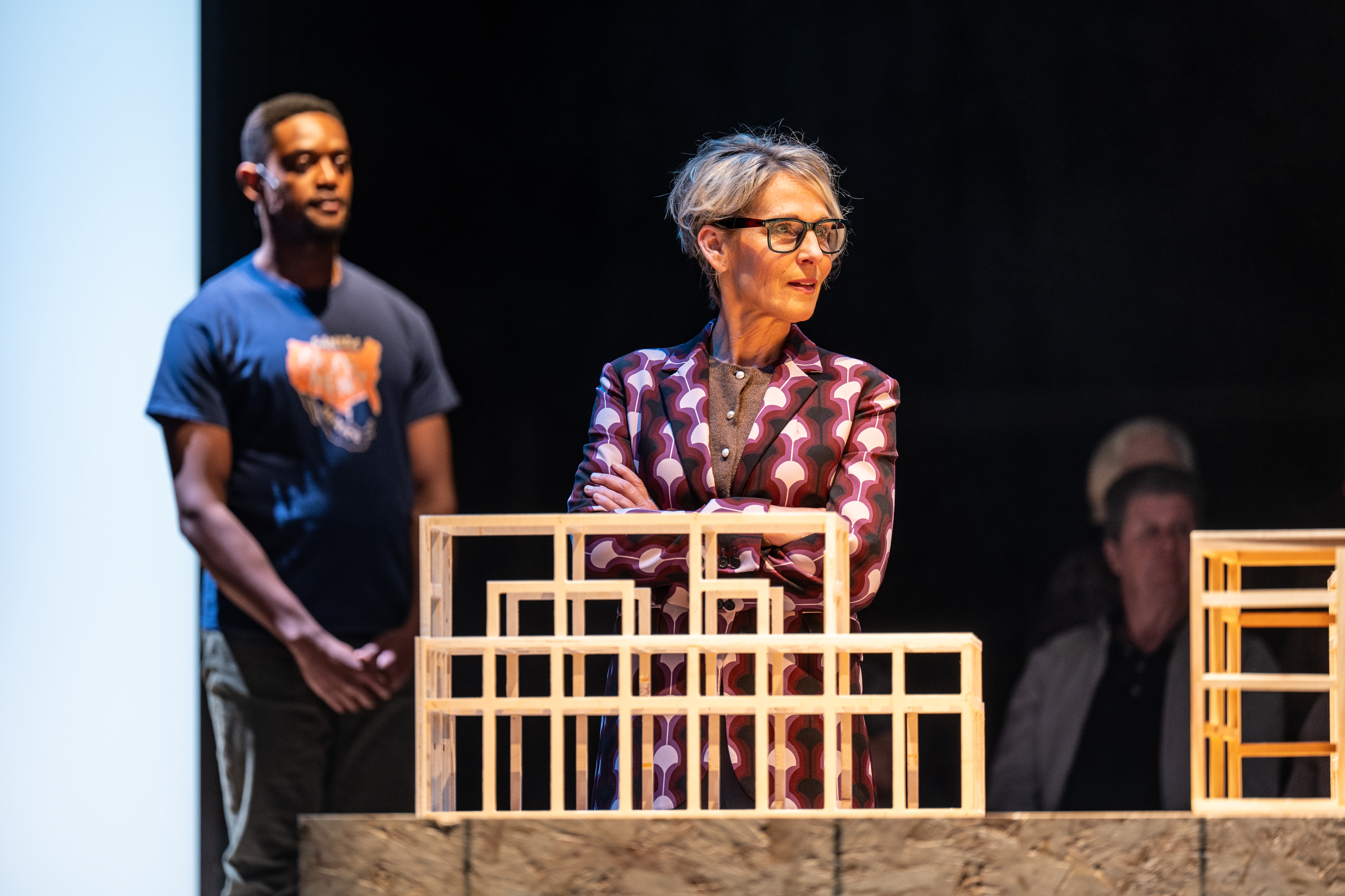 Joshua Quinlan’s stunning set design fits perfectly into the Micheal Young Theatre space, with the same theatre-in-the-round set up preserved from the Crow’s production. The hexagonal floor tiles and wooden mock-up buildings are such a great representation of the work that was actually shown off at Waterfront Toronto during this time. The live video, designed by Amelia Scott, is once again a fabulous tool to remind the audience how televised and public all of this was at the time. However it also allows for close up perspectives on the actors as well, giving us a front row seat for their emotional and thrilling performances.