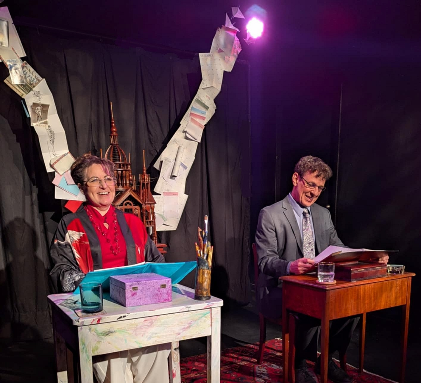 The staging of Love Letters was beautifully emblematic of the two writers. Melissa’s desk is paint covered, with art implements in a funky cup. Andy’s is a proper writing desk with a wood pen box and crystal ash tray. Yet even more symbolic of their personalities are the pieces of paper strung from the birdcage centre stage. Melissa’s are pieces of art, post cards, and other visually appealing pieces of paper. Andy has calendars and schedules; very much like his organized and planned out life. Before the characters even enter the stage, we have some idea of who they are and what their letters are going to be like.