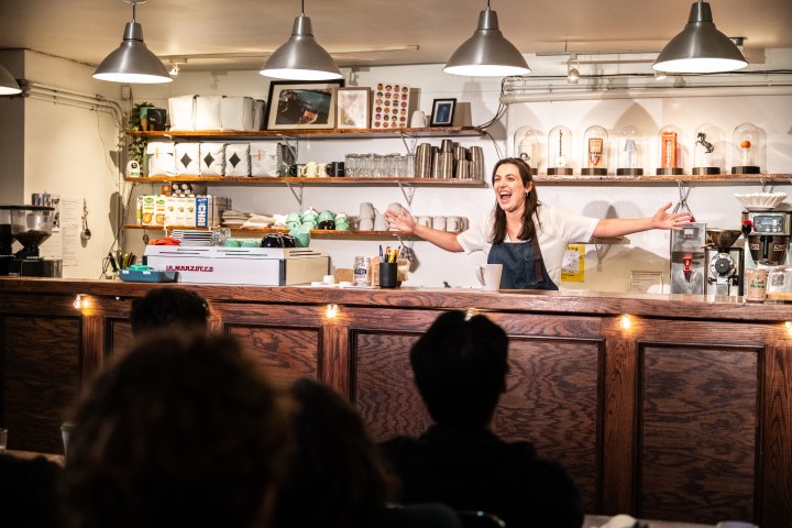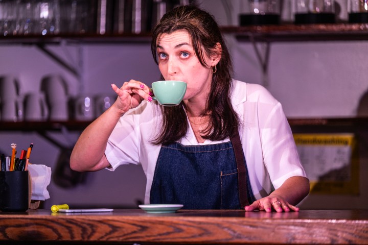 Rosamund Small is an engaging and charismatic performer, easily holding the audience from the moment she starts collecting up our cups and plates at the top of the show. Navigating such a tight room must be interesting: she weaves amongst the chairs and tables several times throughout the show, and yet never seems to mind having to maneuver around someone’s chair. Constantly able to be seen thanks to some tall chairs, a step ladder, and some milk crates at the front of the stage, Small makes use of every inch of the cafe for her performance. She makes frequent eye contact with audience members as well, giving us all that “whoosh” feeling she describes in her show: she’s talking to us and can see us and we, in turn, get to see her.