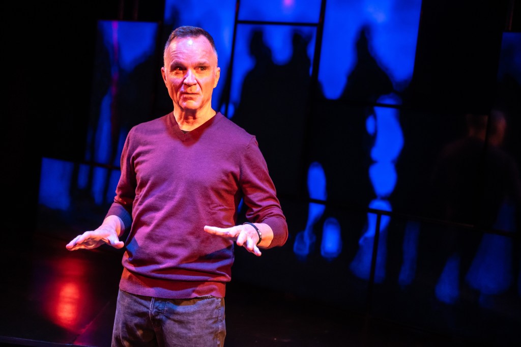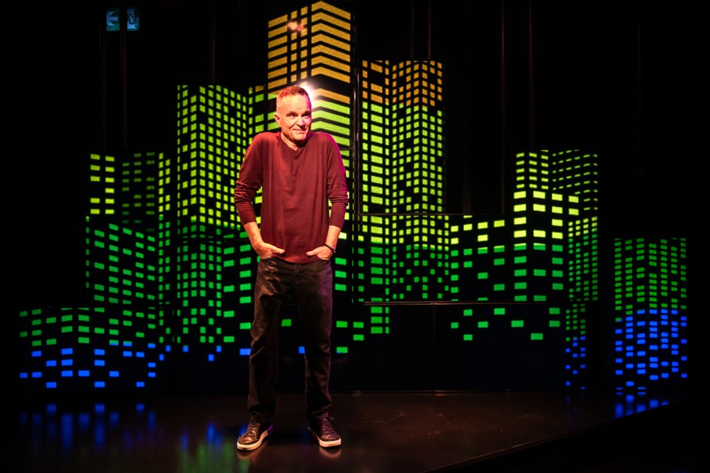 Denyse Karn’s set and projection design make great use of the LED screens at Crows to create everything from a rainbow cityscape to showing photos of news headlines, club posters, and protests. Audiences are able to see first hand the seminal moments Wilson describes, and it certainly adds into this idea that he’s doing a TED-talk style seminar for the audience. André du Toit’s lighting design is also helpful to indicate the moments where we’re immersed in Wilsons memories and when we’re actively being addressed as members attending this seminar.