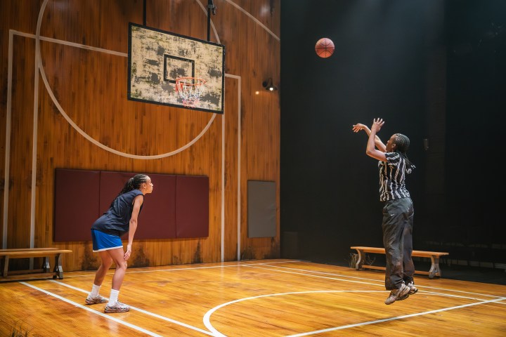 Ken Mackenzie’s incredible set design defies expectations – taking the gymnasium we know and giving it a larger-than-life theatrical treatment. The court is split in half, with one key on the floor while the other comprises the back wall of the playing space. Mats line the lower portion of that wall with gym bags on the benches below. A tricolour net hangs from a dirty backboard, embodying the outdoor dirt court and standard gym courts the team plays on. Combined with Radha Javanfar’s lighting design, the Guloien Theatre becomes full of life, light, and the excitement that can only come from a great basketball game.