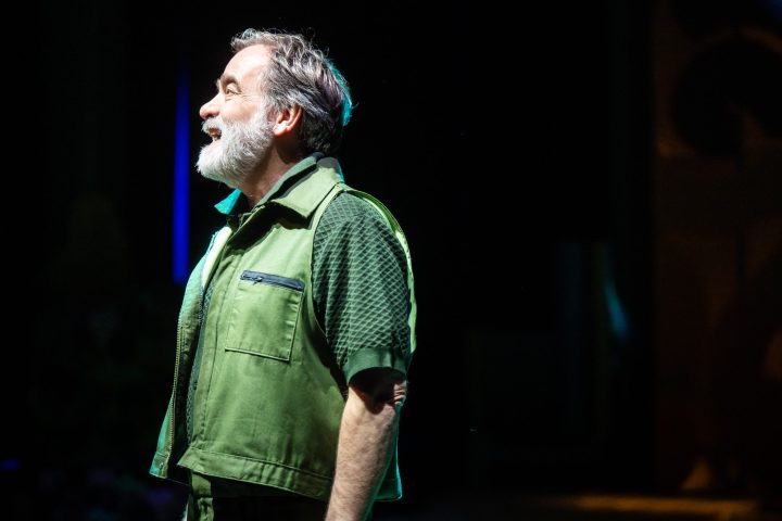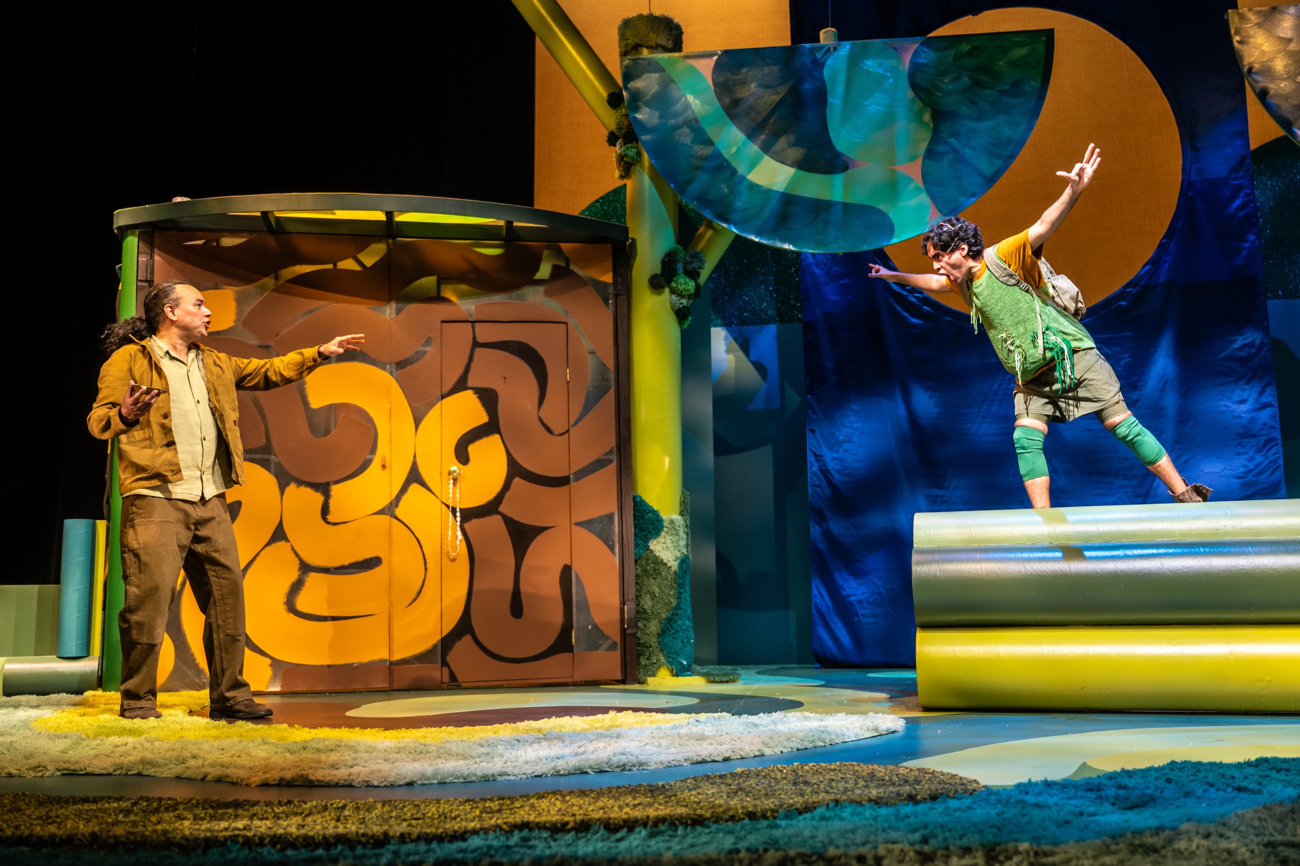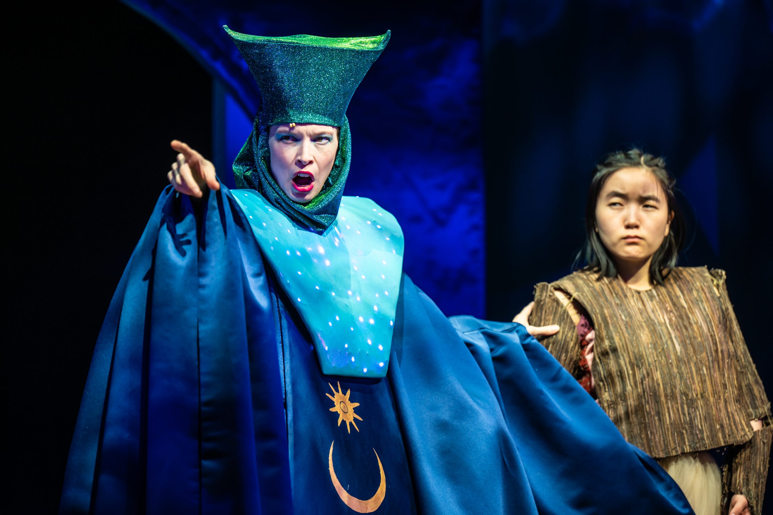 The Ada Slaight Stage has been transformed into a scene from a picture book thanks to Ting-Huan挺歡 Christine Urquhart’s dreamy set design. With tufts of yarn on the bushes, removable colourful rugs to represent the Earth being gardened, and a fabulous reveal for the arrival of the fairy queen, this set is full of wonders. A particular favourite was how the various set pieces light up when there are fireflies in the air or when the fairies come to visit; it’s such a simple thing yet adds so much magic to the scenes. Likewise the clothes of the people are colourful and perfectly juxtaposed against the Earthy tones of Wicked Nix and Mr. Green’s costumes. The Faerie Queen is on a whole other level though, with the moon phases gracing the front of her lavish robe. The experience feels truly enchanting.