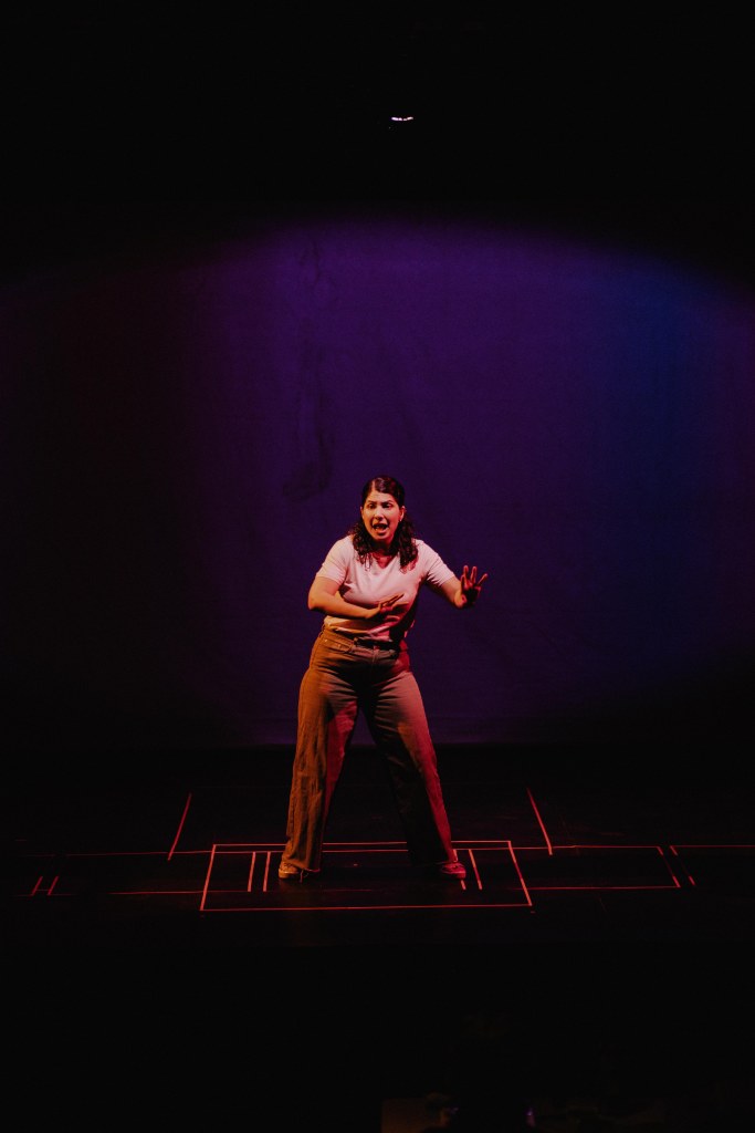 TCL Collective, Aluna Theatre, and Factory Theatre have also teamed up with the crew at Theatre Passe Muraille to provide some accessibility features for this production, including subtitles for the show. There is open captioning available in both English and Spanish, and those dates are listed on the show’s website (linked below). There are also some translations projected onto the stage as well, which makes everyone able to understand the moments where Monica and God speak in Spanish. This blending of languages makes the title all the more apt, as Monica is perfecting her English skills throughout the story as well as…other equally important mouth-based ones. At the performance I attended, there was a whole group of Spanish-speaking audience members, so that when Monica asked us to repeat something back but in Spanish, there was no hesitation from that part of the audience at all!