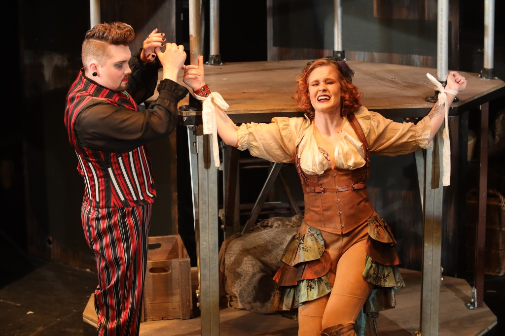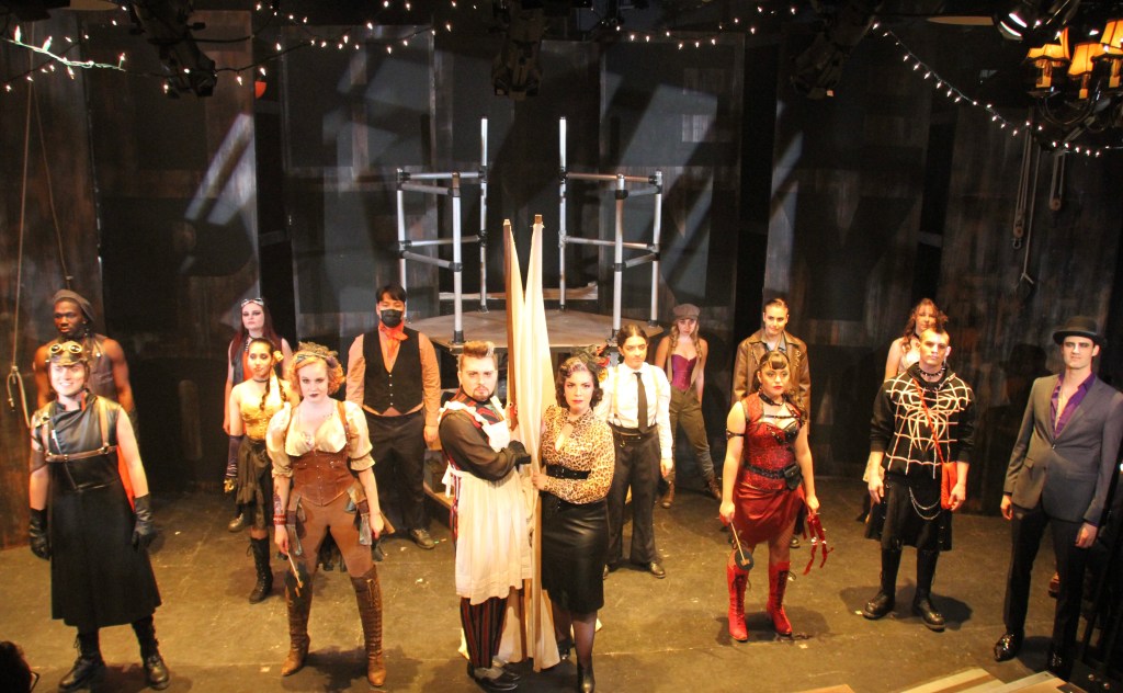 That being said, there were certiainly some standout performances within the cast of The Threepenny Opera. Rhys Parker’s Balladeer was enchanting and engaging; his audience work is quite good as well. Cameron Helmkay’s Jenny is passionate, and she has the vocal prowess to match. Similarly, Aria De Castro gives a tantalizing performance as Mrs. Peachum, and her powerful voice was perfect for her role. Madison Buchanan and Jacob Klick, Polly and Macheath respectively, handle the vocal side of their characters well, but there’s certainly not the same scintillating chemistry between the two as is implied by the text. Maggie Tavares’ Tiger Brown was more feminine than ferocious, but her vocals roared. Kaden Klodt, Sean Lee, Nicole Lynch, and Chris Otchere provided much needed comic releif, and put the punk in steam-punk. Liam Armstrong’s Mr. Peachum is flamboyant and fearsome. Jasmine Jenkinson, Vandada Maharashtra, Joelle Salsa, and Zoe Saum take on several roles including police officers, ladies of the night, and beggars.