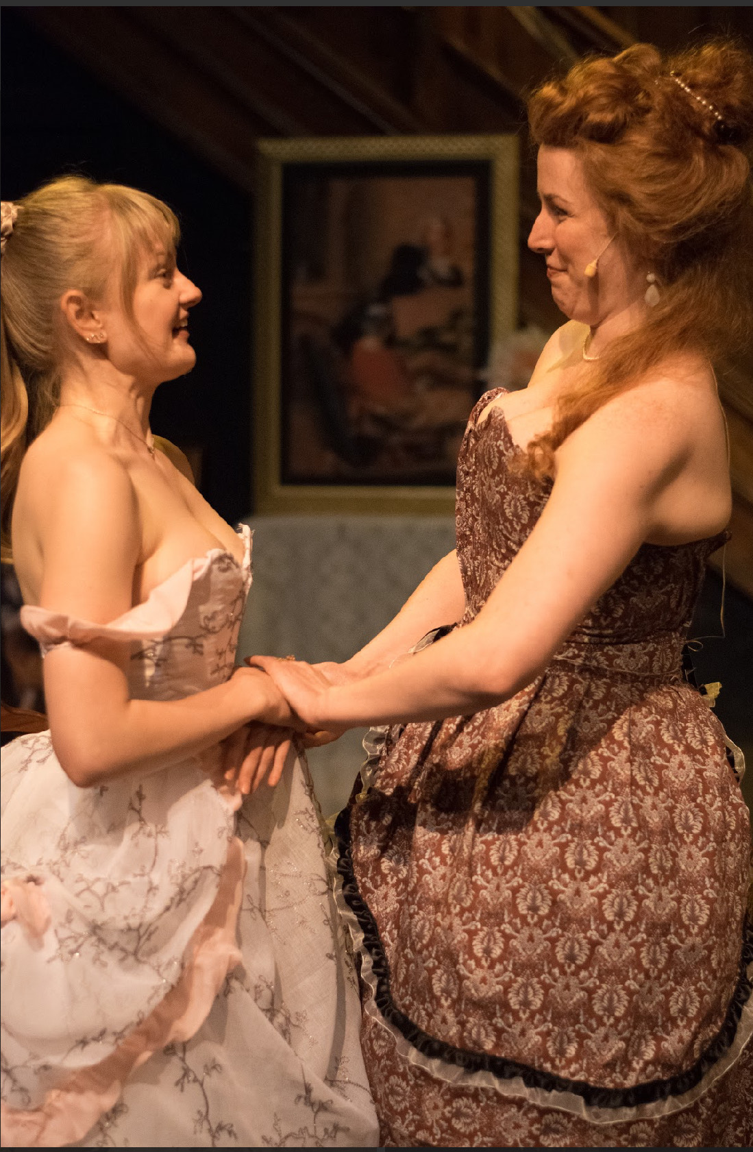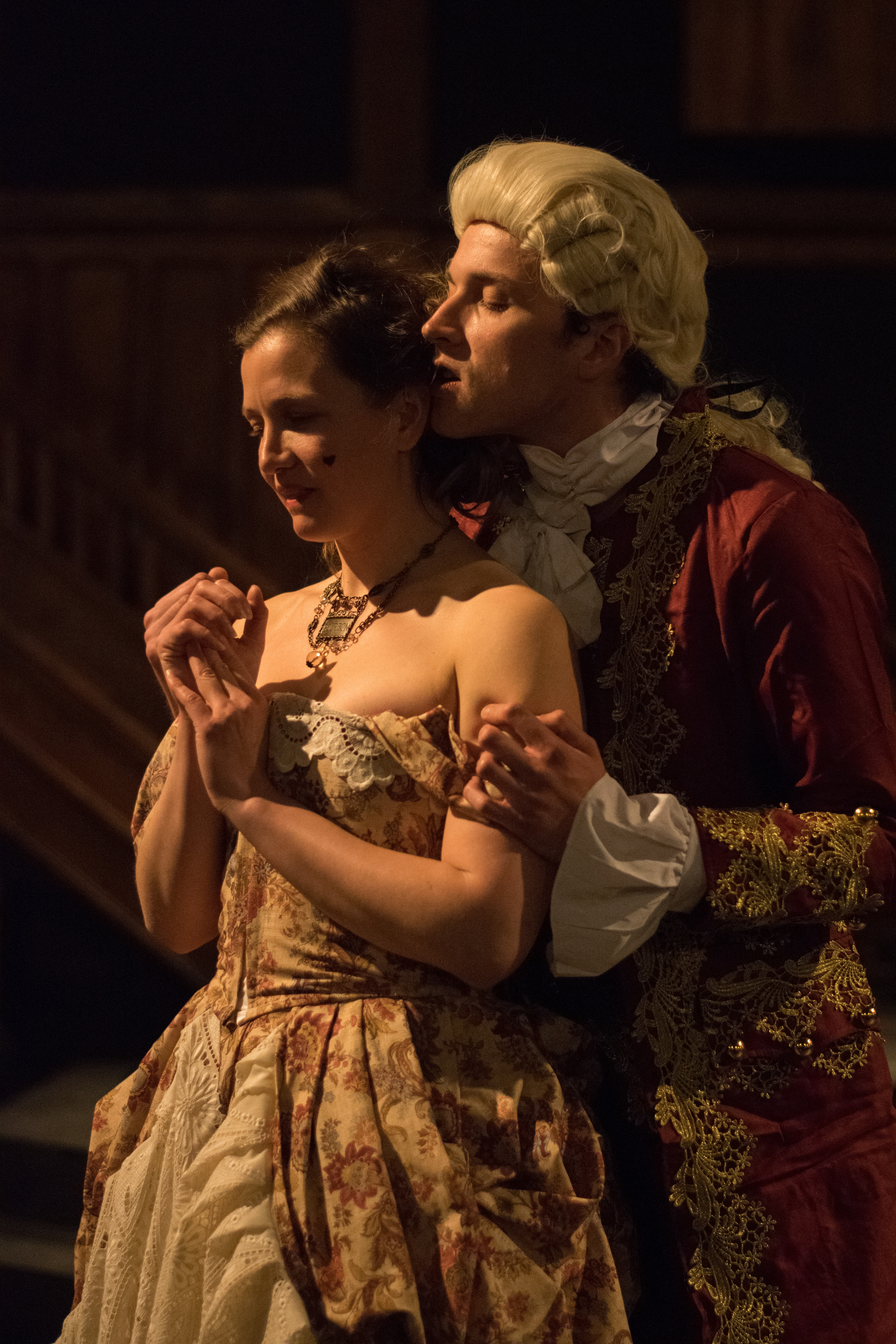 The Annex Theatre space has been beautifully adorned to suit the glamour of the time. Famous Rococo paintings grace the walls, along with flowers, silks, and gorgeous furniture. Serhat Dogantekin’s set design immediately gives the feel of the grandeur of Paris’ high society in the late 1700’s. Liam Cardinell’s lighting design enhances the ambiance of the set perfectly. The music choices were also perfectly on point for the time, with recognizable pieces completing the experience. Lee’s costumes are stunning; showing just the right amount of skin to be scandalous but with the paniers and fabrics of the time, I would happily wear everything that’s shown on stage!