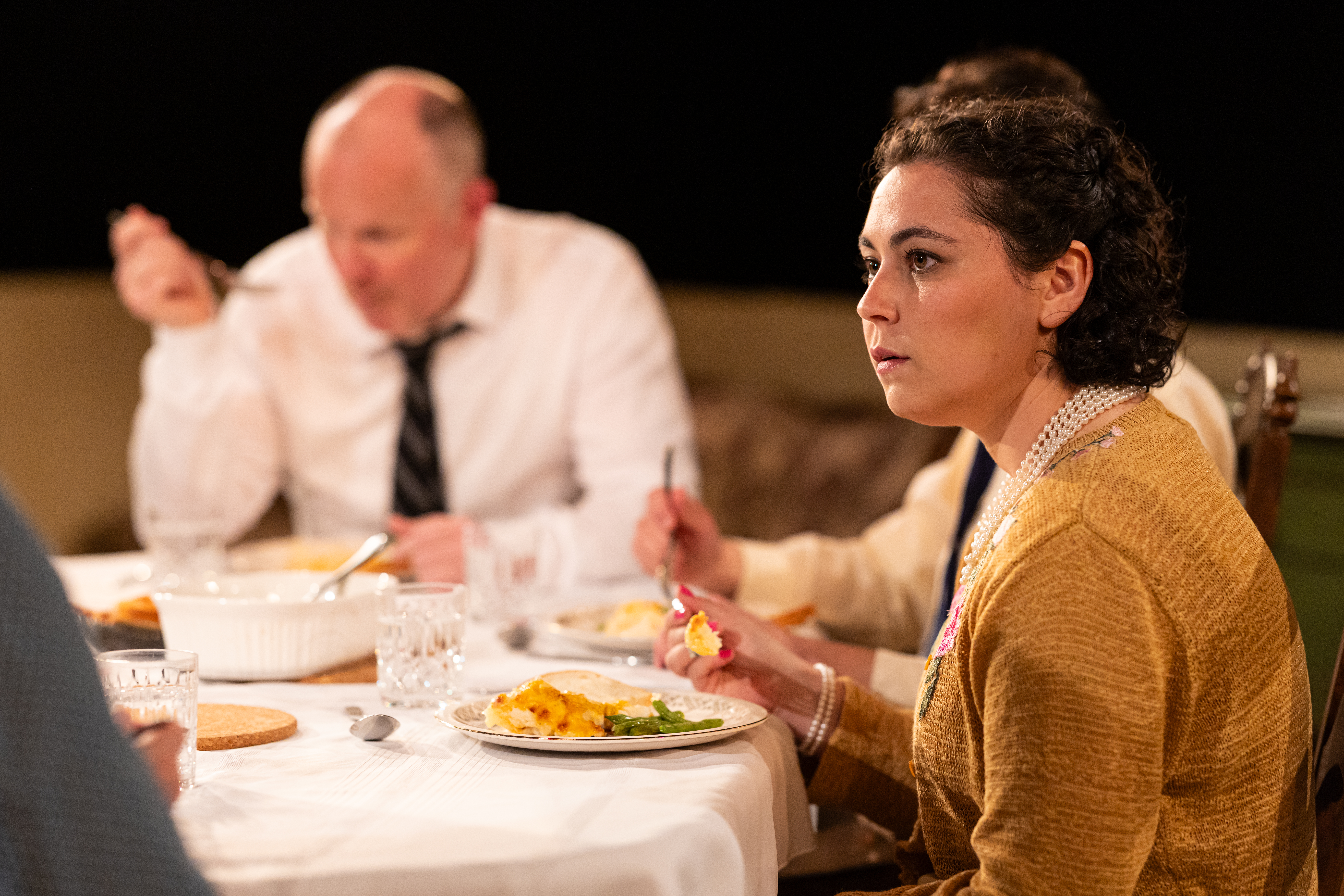 Wesley Babcock’s scenic design makes for a tight squeeze in the Coal Mine Theatre, yet they are able to put chairs on all four sides of the set. With half walls to give the illusion of the house, the inside is a perfect 1950’s living room and kitchen, complete with an old school fridge, the same sofa and chairs you’ve likely seen at your grandparents’ houses, and a beautiful turntable cabinet. The audience’s proximity to the performers is part of what creates this sense of being a voyeur into their lives; it’s like looking in on your Sims as they go about their day. Kaelen MacDonald’s costume designs cement the 50’s feel, with petticoats, cardigans, and tweed suits galore. The attention to detail in this production is impressive, even ensuring that there’s real food on stage for the characters to eat (which smelled amazing) and having the turntable function inside its cabinet.