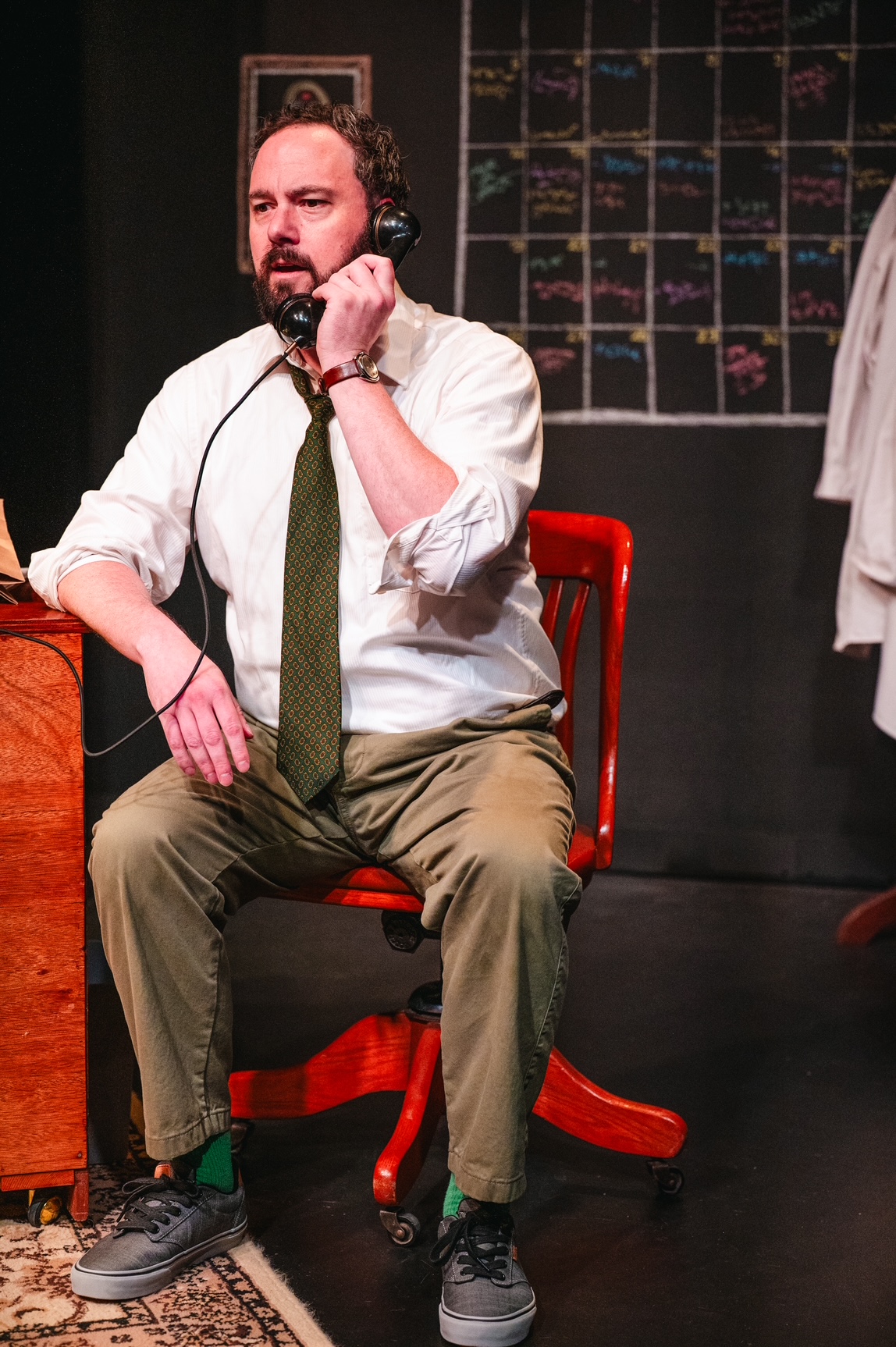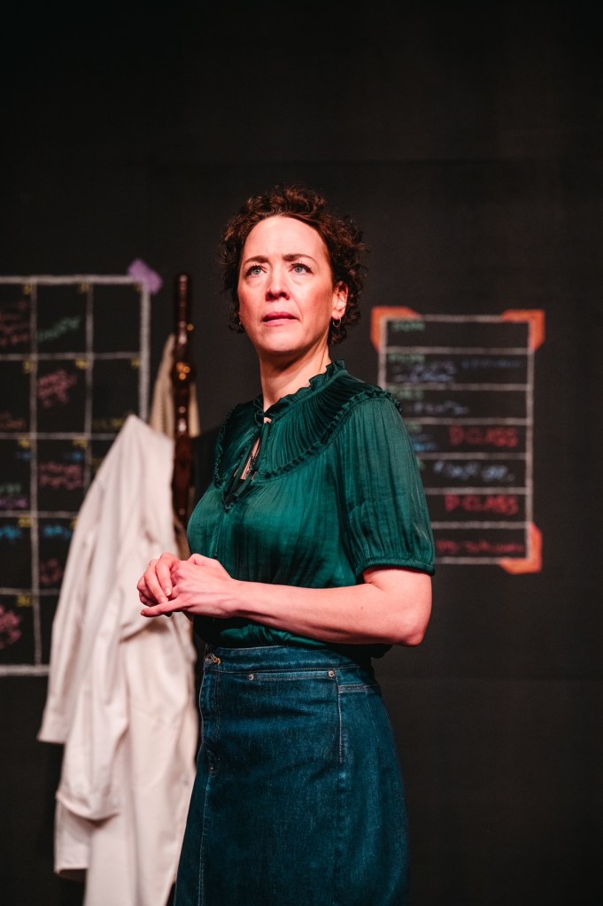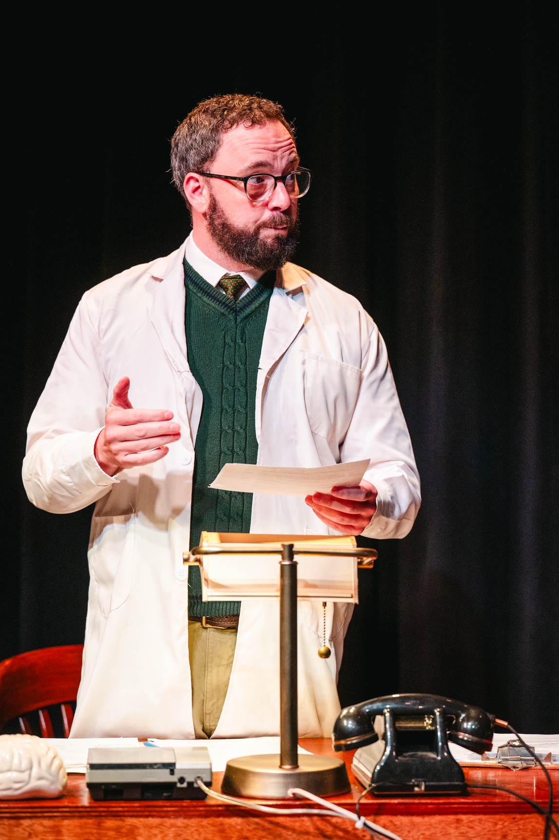 Freddy Van Camp has transformed Here For Now’s Theatre into a cozy office space, even using chalk on the back wall for the professor’s calendar and to-do list. A large desk, complete with a tape recorder (remember cassettes?), lamp, and landline sit to one side while a large reclining chair with a machine next to it sit opposite. Rebecca Chaikin’s costumes suit the characters perfectly: the professor in a stereotypical sweater vest, lab coat, and glasses, while Evelyn’s wardrobe is calm, muted and practical.