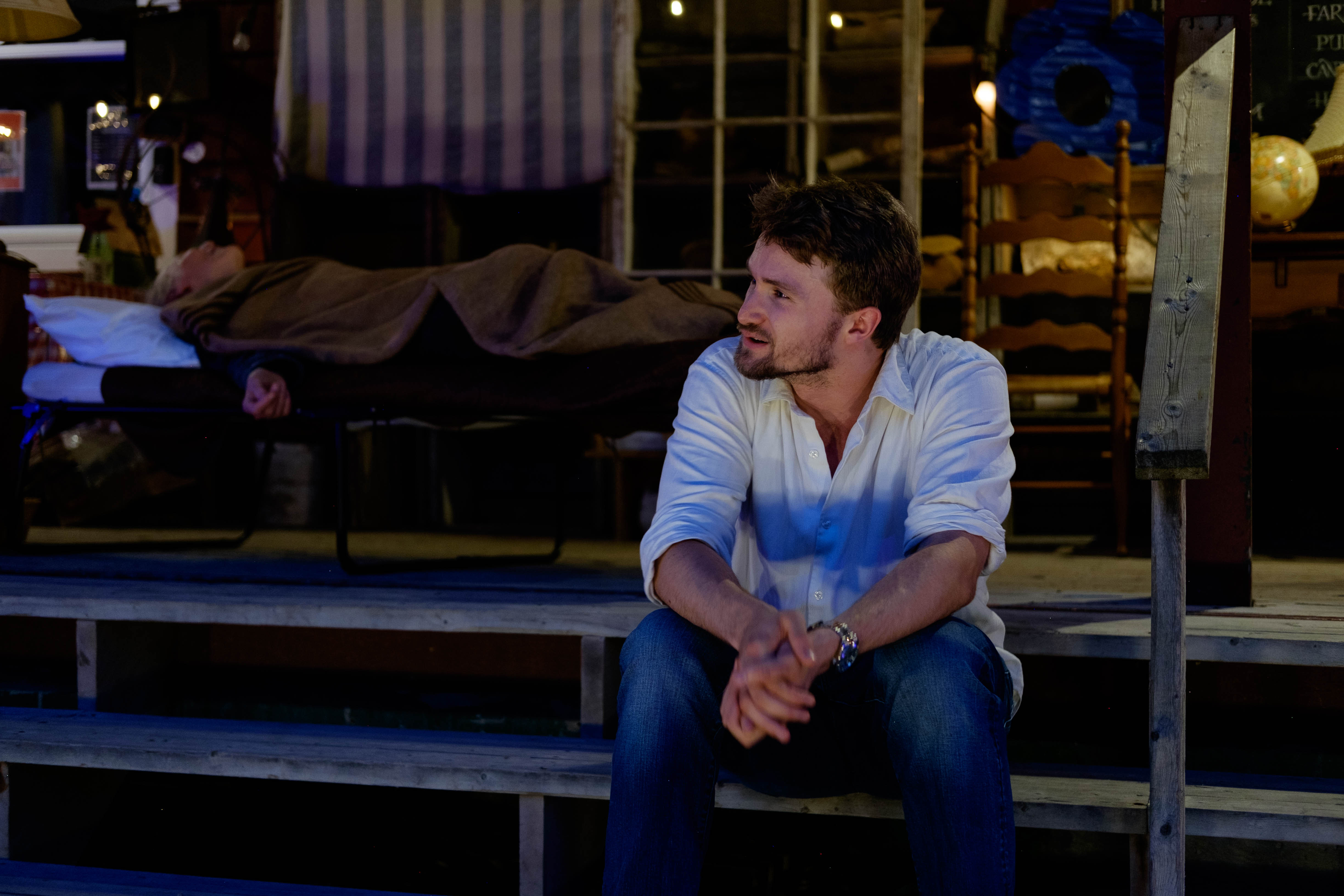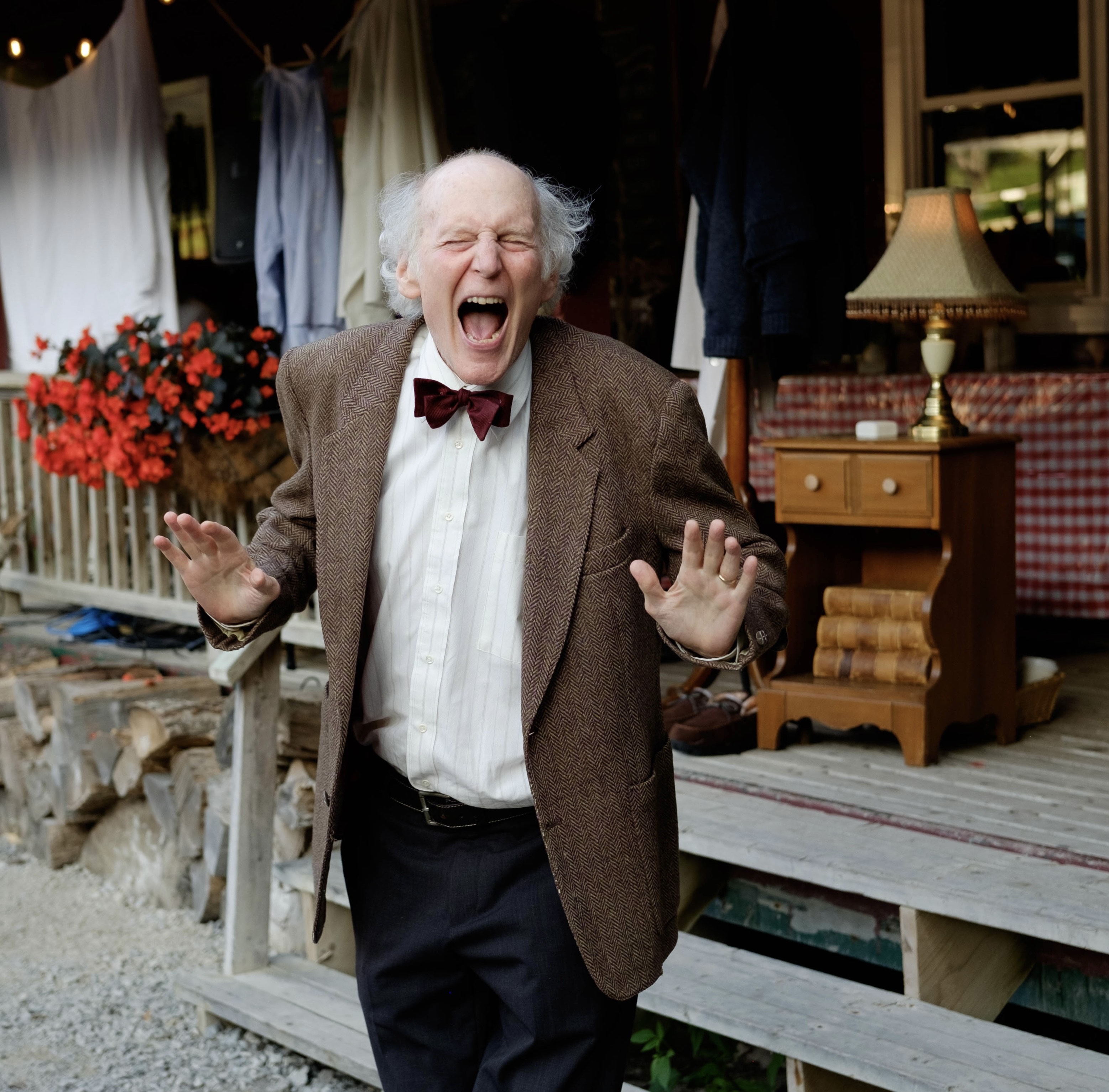 Once again this year, King Theatre Company has teamed up with the folks at Pine Farms Orchard to bring their summer offering to life. The porch has been designed to look like Morrie’s study: a typewriter, small globe, record player, and comfy armchair immediately give it a professorial feel. Adding to Morrie’s aesthetic is his tweed jacket with the leather elbow patches and bow tie. As the sun sets, Lisa Van Oorschot’s lighting design makes the performers sparkle, and completes the ambiance of a performance out under the stars.