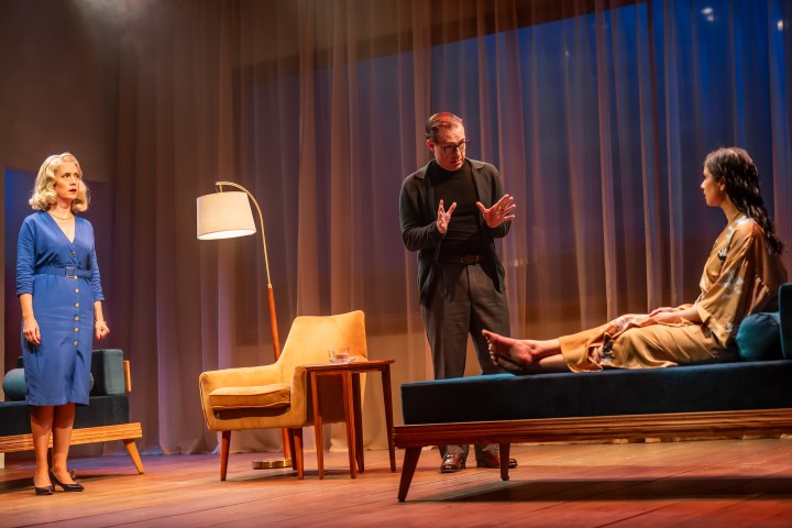 Old Times is a living room drama about a couple, Deeley (Christopher Morris) and Kate (Anita Majumdar), who are having one of Kate’s oldest friends Anna (Jenny Young) over for a visit. While the couple debriefs about this friend, Deeley realizes that despite the fact that he’s been married to Kate for many years, he doesn’t know much about her life prior to their marriage; he didn’t realize that she and Anna had roomed together for many years, for instance. Once Anna arrives, the three begin to chat about their University days, and various escapades of their youth. It’s only once Deeley and Anna are alone that the past begins to truly reveal itself and the three characters become more intimately intertwined.