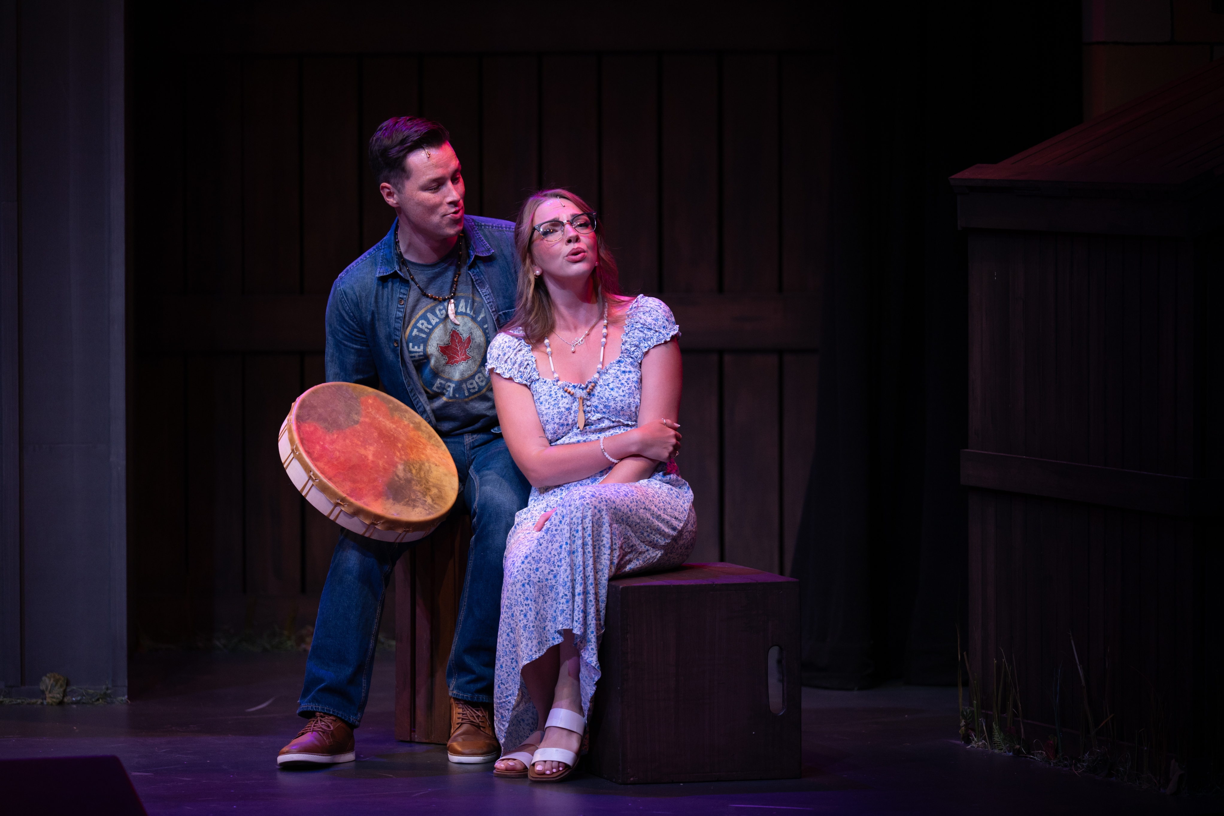 Cale Crowe and Genevieve Adams’ script is funny, heartfelt, and hopeful, while also being real about the unintentional pain we can cause those closest to us. The text also mirrors some of Crowe’s own life experience of moving back to Alderville after having been away for several years, which adds a level of understanding, but also hilarity, to the text. There are jokes which are clearly meant as in-jokes, and sometimes they were referred to as such in the script, making us laugh even harder. Crowe’s music is also so on point for the rest of the content. A beautiful mix of more traditional show tunes, epic rap numbers, and millennial throwbacks, all with a Snotty Nose Rez Kids flair to them, make for a thrilling score. I desperately hope that there can be a recording made of this original cast, because it’s like these songs were tailor made for them and each performer got to shine in their own way.