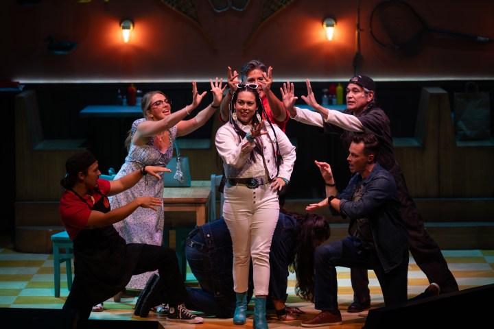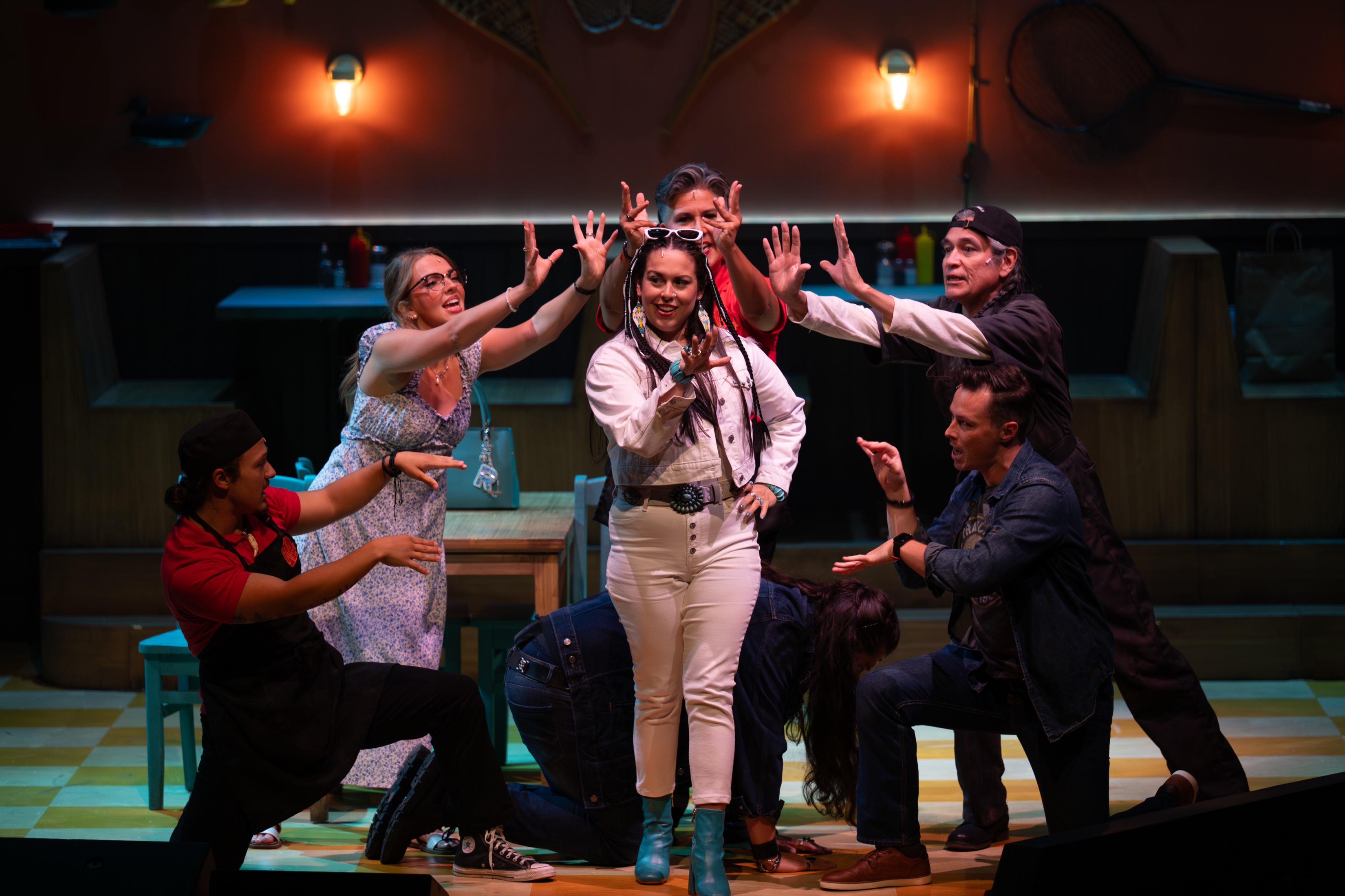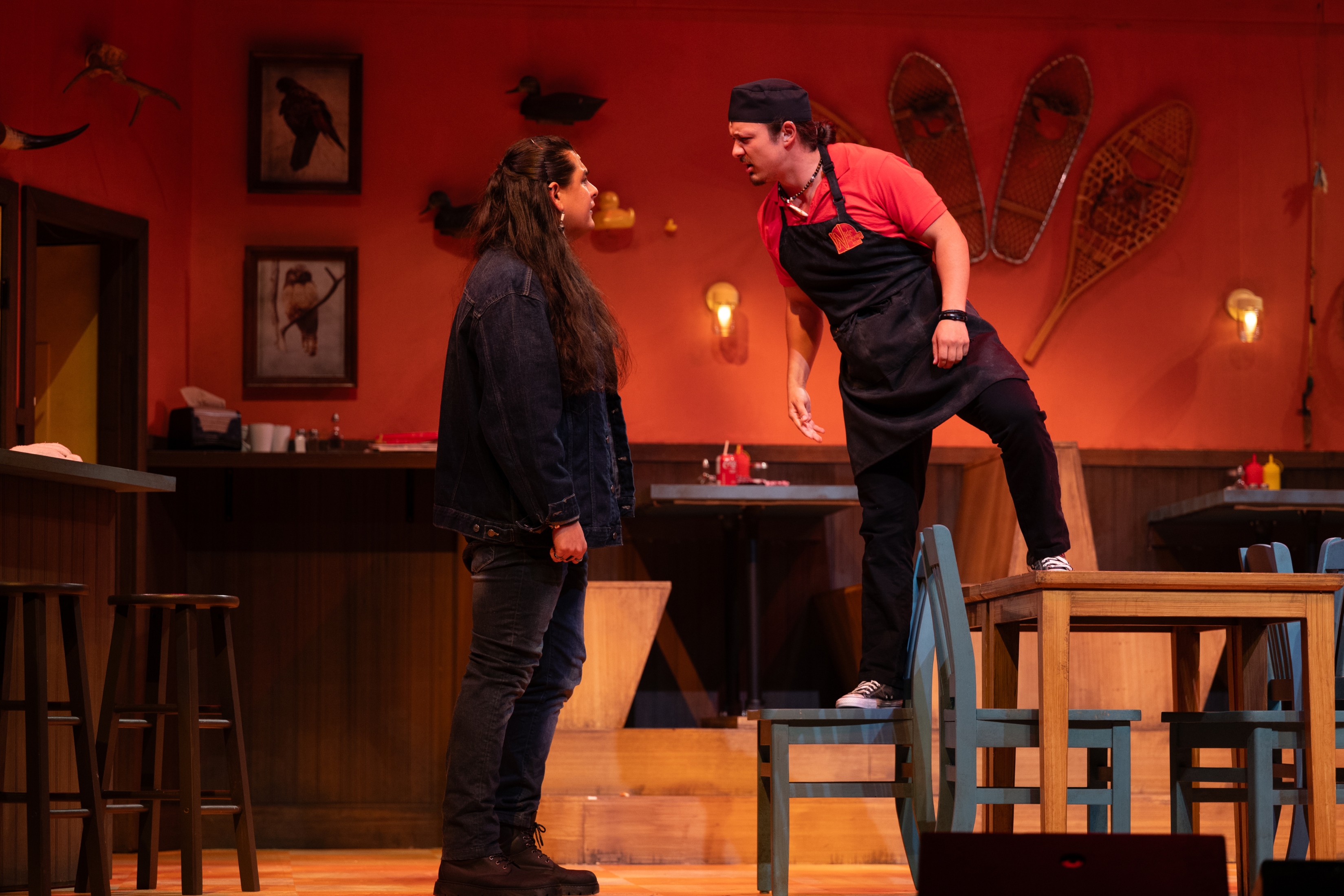 When you enter the historic Capitol Theatre, you’re immediately thrust into a vintage-style diner. The sign above reads “Wide Wigwam Restaurant” with “Go Kart” and “Gas” on either side. It’s so perfectly small town; why have three separate spots when you can just have all three businesses in one building? The walls are covered in old snow shoes and paintings, as well as a series of ducks which include both a large and very small yellow rubber duck amongst the other larger models. Jung-Hye Kim’s set design gives perfect diner vibes with wood booths, stools along the counter, and condiment holders on each table. Yolonda Skelton’s costume design likewise embodies the characters in every detail: I loved Leon’s more rock aesthetic, especially compared to Destin’s more muted style and the diner uniforms worn by Nolan and Lucy. Mackenzie’s costume also immediately announces who she is and gives us some…stereotypical ideas of what she’s going to be like. The attention to detail in both the design and the writing is what makes Rez Gas the success that it is.