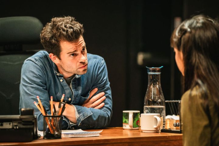 An element of the directing which I appreciated was how the two were clothed and how their layering worked (costume design by Emily Anne Corcoran). Initially John is in a full suit, with a denim shirt underneath, while Carol is wearing a simple camisole-style top. The next time she visits, she’s got a long sleeve shirt on and John’s jacket has been removed. In the third visit, John is down to a grey undershirt and Carol’s got a jacket over her long sleeve shirt, indicating the power shifts which have occurred. This was fascinating to watch, as the two quickly donned or deserted their various layers, and was a very visual representation of what was happening through the dialogue.