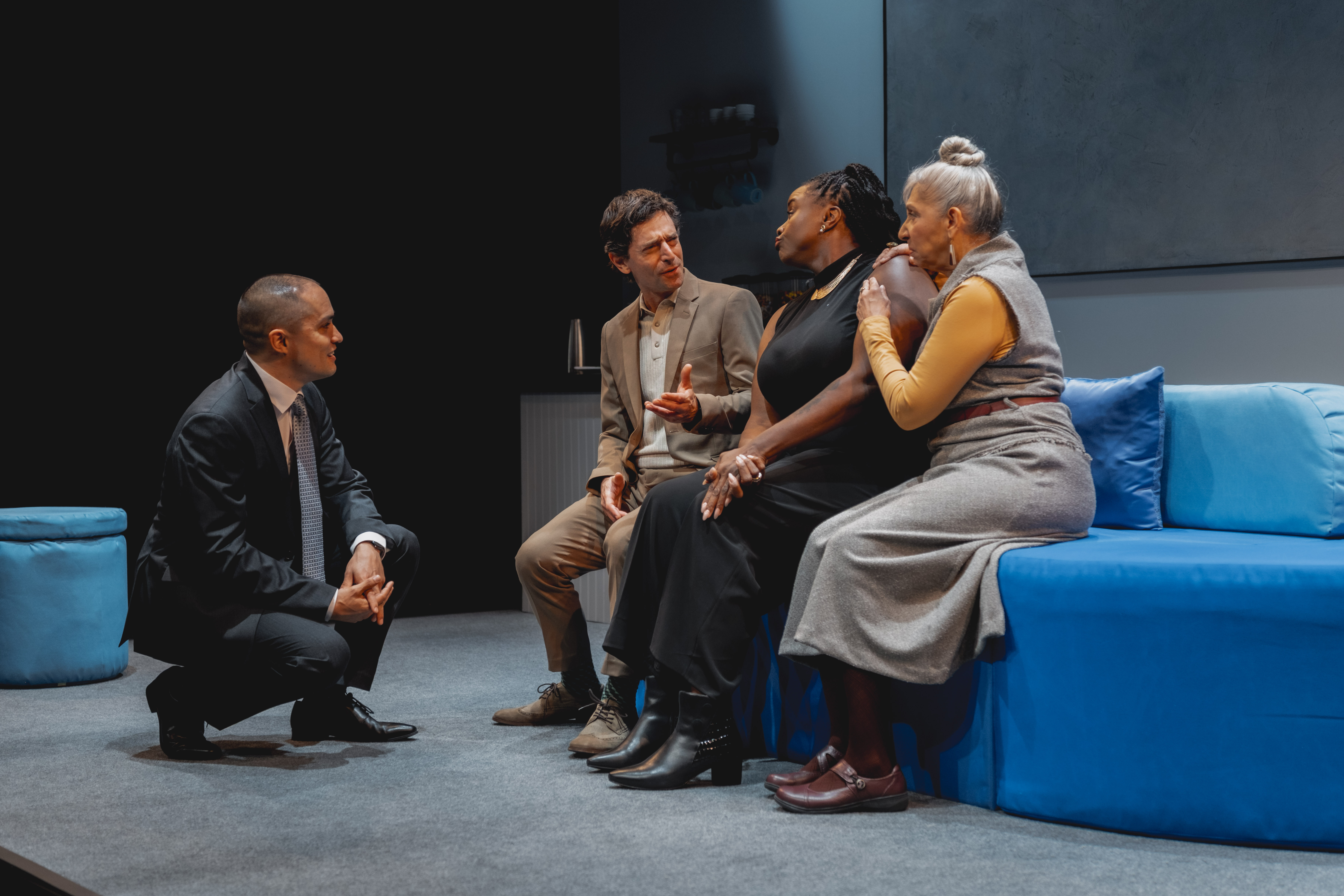 However, what makes CHILD-ish unique is that there are four adult performers saying the words of the young people Drake actually interviewed. Amanda Wong’s set design put us in what looks like a hotel conference room, except that the couch which sits centre stage is clearly modular, like one of those foam play sets which are popular with young kids. Five adults enter the stage: Asher Rose playing Drake, and the other four who then embody the essence of the children. Karl Ang, Janelle Cooper, Monique Mojica, and Jordan Pettle somehow manage to both look and act like adults (for the most part, anyways) while fully embracing the spirit of the kids they’re playing. They’re brilliant performers, and take on this incredible challenge head on with such verve that you can’t help but laugh along with their antics.