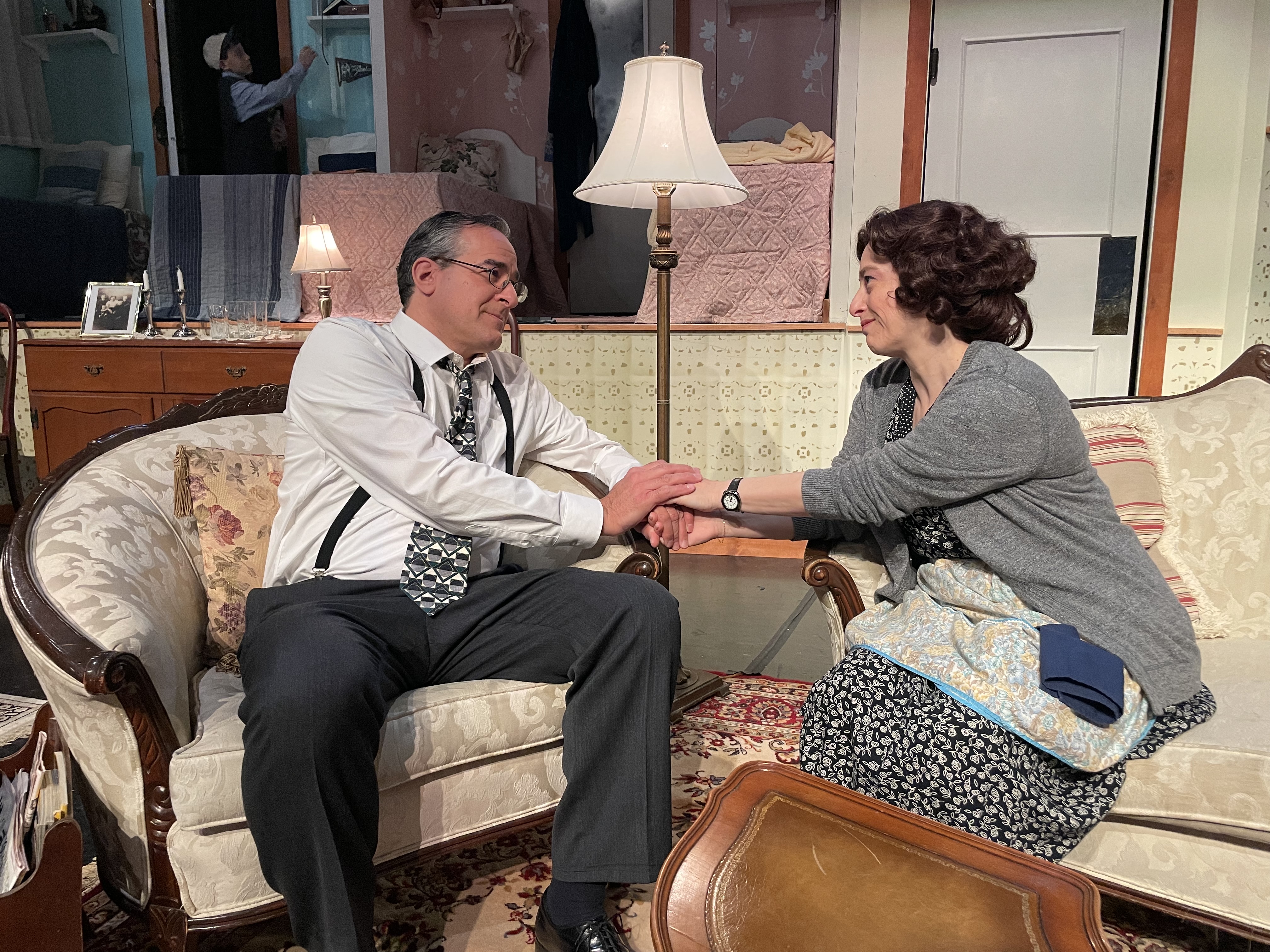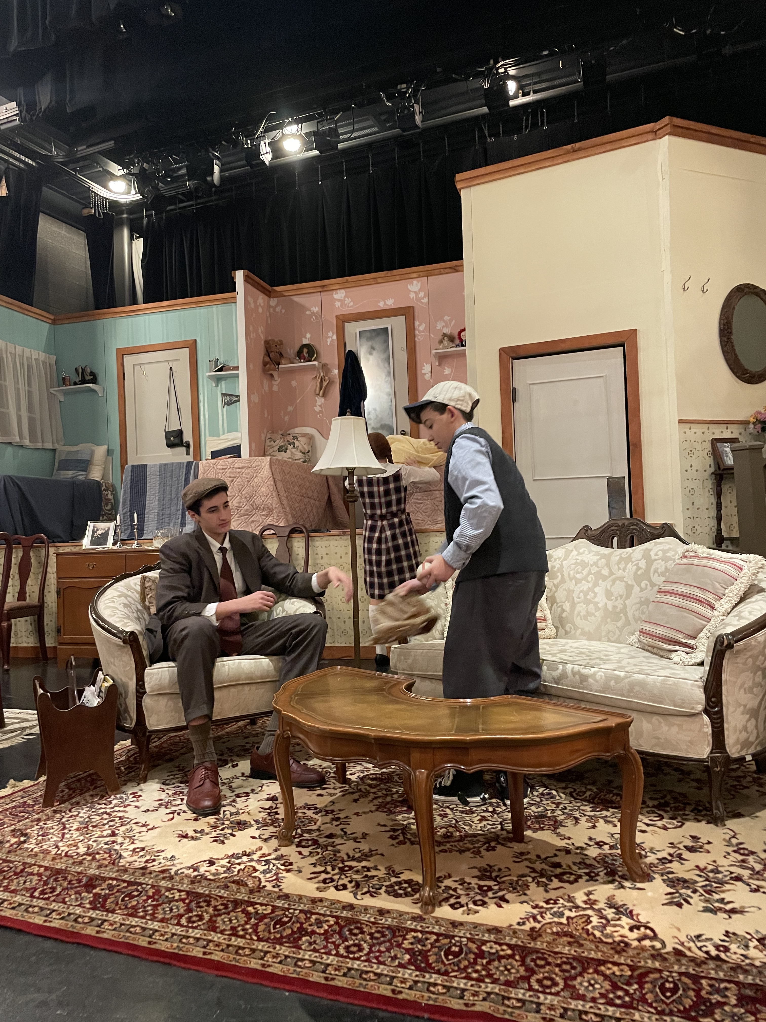 Right away I was struck by the beautiful set which Ashely Whitten has designed for this production. The set has been brought right to the front of the space, so that the front row is practically sitting in the living room and dining room of the house. The upstairs is divided into the rooms for the boys and the girls (which used to be one room as Eugene will happily remind you). This masterful design gives the feeling of the cramped nature of the family’s living situation, while also having plenty of unique spaces for the scenes to take place. It allows for comedic moments as well, as you can see into other rooms even when the focus is elsewhere; there’s a whole lot of ears pressed against walls and doors as some of the most pivotal conversations go down in other rooms within the house. I also loved how there was laundry hanging on the sides of the theatre; it evokes that stereotypical image of New York fire escapes covered in clothes which we’ve come to know and love. Liza Zawadzka’s costumes are fitting for the time period from head to toe. I love the argyle sweaters, floral aprons, and pearls the various characters don throughout the show.