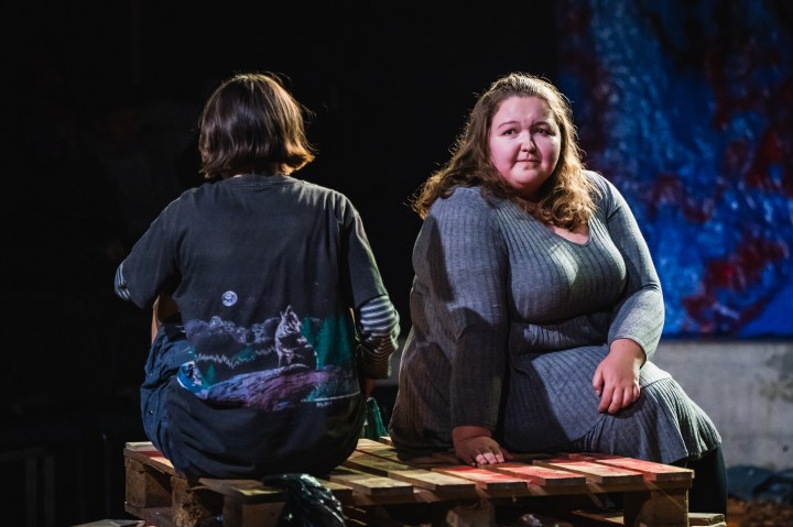 The Theatre Centre’s BMO Incubator Space has been transformed into a grungy, makeshift hideout. Real leaves, pallets and tarps covered in graffiti, and the refuse accumulated from past parties litters the stage. Immediately you get the feeling that this is a frequently used outpost for the group, and the opening vignette of their party only confirms those suspicions. It’s their home base, their meeting spot, a place of retreat for when the world gets to be too much. And the world is about to be far too much for any of them to handle.
