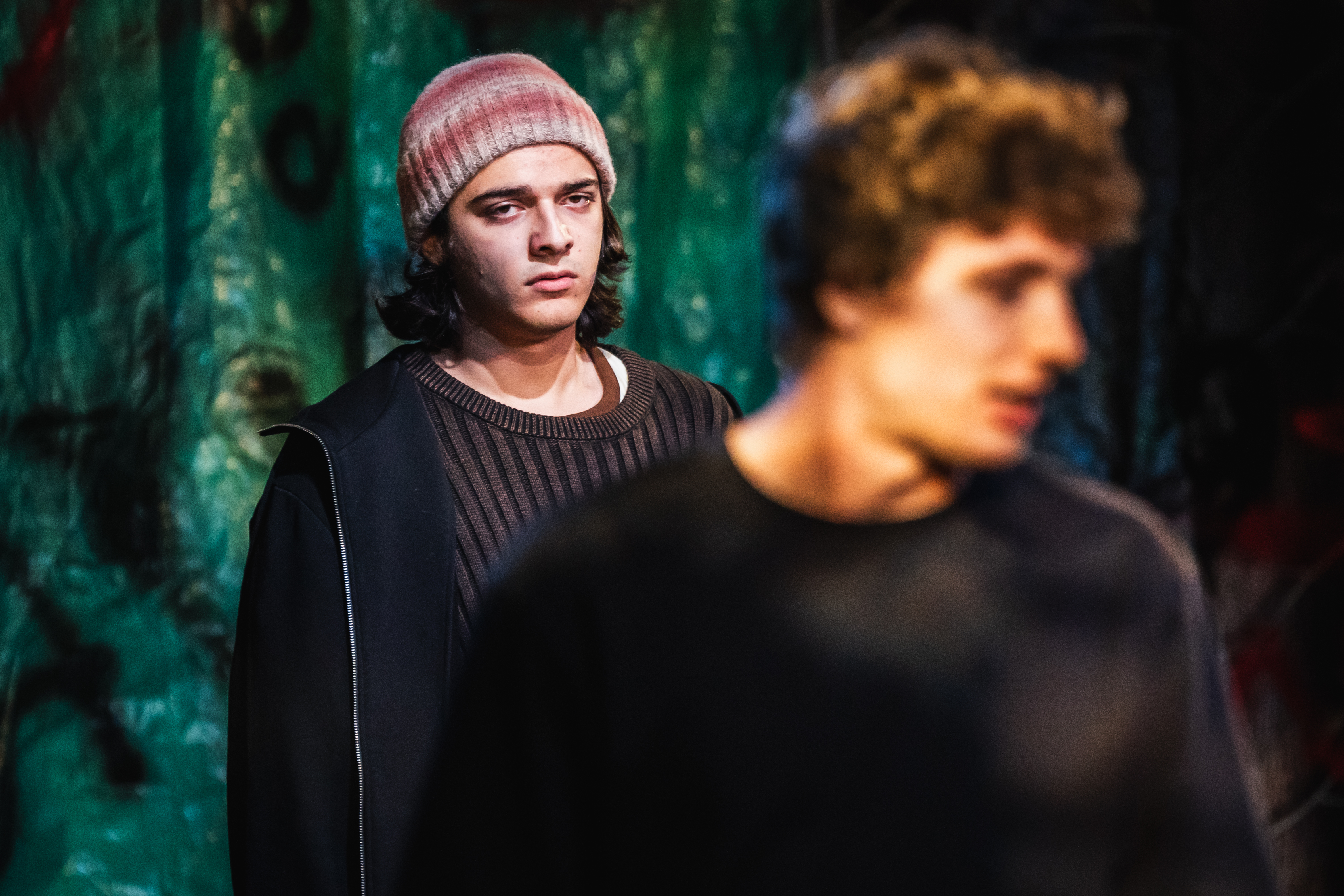 Icarus Theatre has assembled an ensemble of emerging talent to tackle this ambitious play. Morgan Roy’s Leah and Chantal Grace’s Ray are perfect foils for one another: Roy has a bold stage presence and Leah is very chatty and thoughtful, while Grace’s Ray is quiet until absolutely necessary, and even then Ray can be forceful in her instructions to the other teens. Seydina Soumah’s Mike and Avril Brigden’s Jan somehow always seem to be the bearers of the bad news, which gives the two of them these mysterious scenes full of choppy dialogue which the two handle well. Brennan Bielefeld’s Danny is delightfully neurotic, his sole concern of his future in dentistry initially garners laughs yet wears thin as the situation becomes more dire. Haneen Paima’s Lou is the often-ignored voice of reason, and presents an interesting counterpart to Ivan Anand’s Richard, who also floats on the periphery of the group until the story’s conclusion. Jonah Fleming makes an impact with the little stage time he gets as John Tate; he’s the initial leader of the group whose intimidation tactics Ray seems to have picked up. Emily Anne Corcoran plays the slightly unhinged Cathy; she gives her a decided wild side which is frightening. However, some of the stand out performances come from Zaniq King as Bryn and Jeremy Foot as Boy. Both characters go through trauma and have psychotic breaks in various ways. Both King and Foot embody these breaks in unique ways, yet they’re equally as gut-wrenching and unsettling.